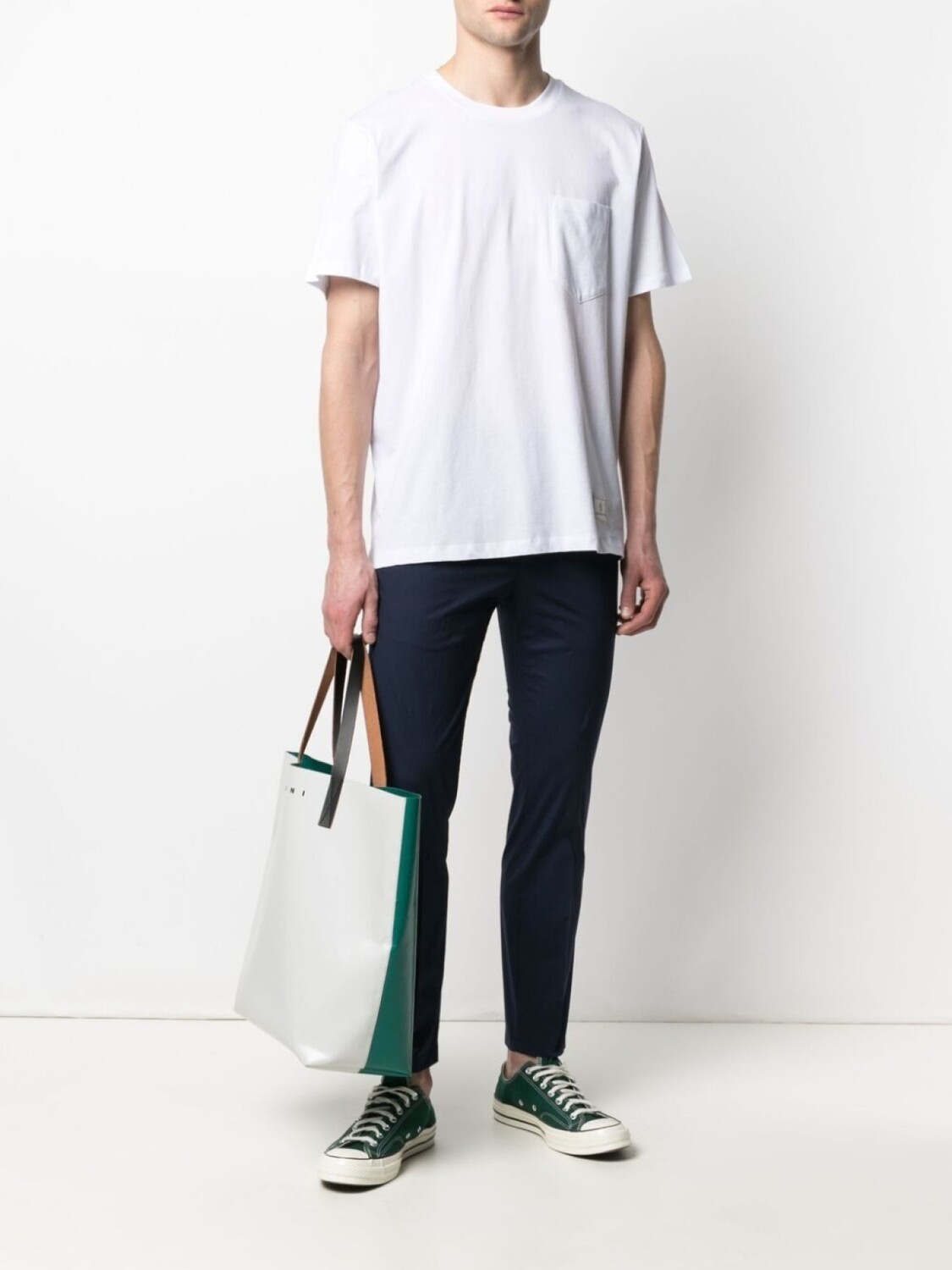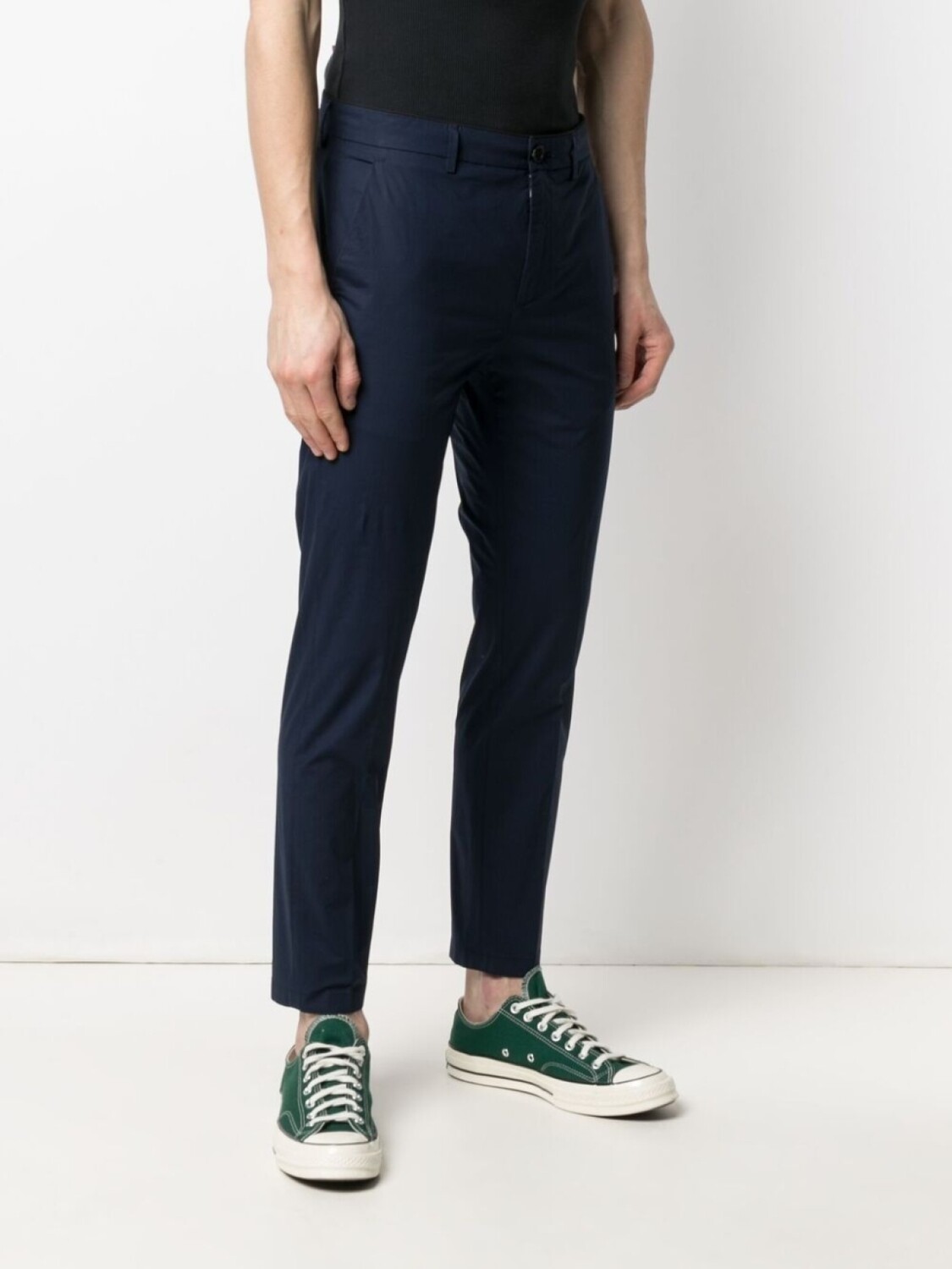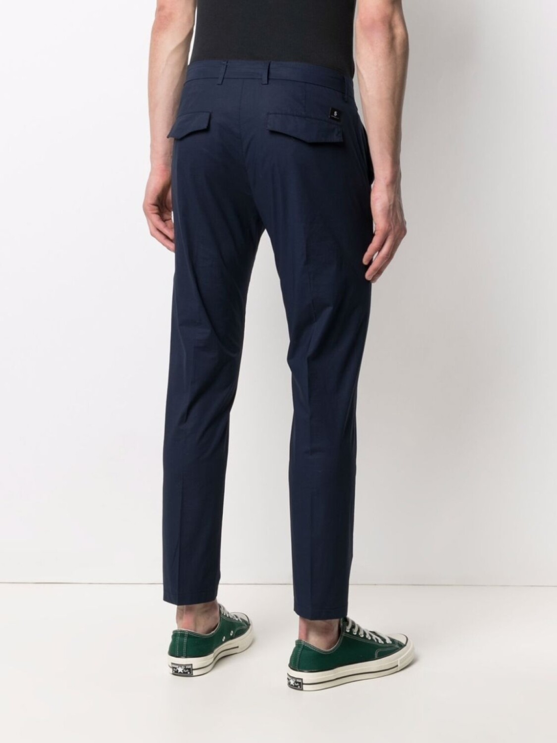 Средняя посадка, петли для ремня, застежка на молнии и пуговице спереди, два вшитых кармана по бокам, два кармана с клапанами сзади, узкий крой и длина по щиколотку.
