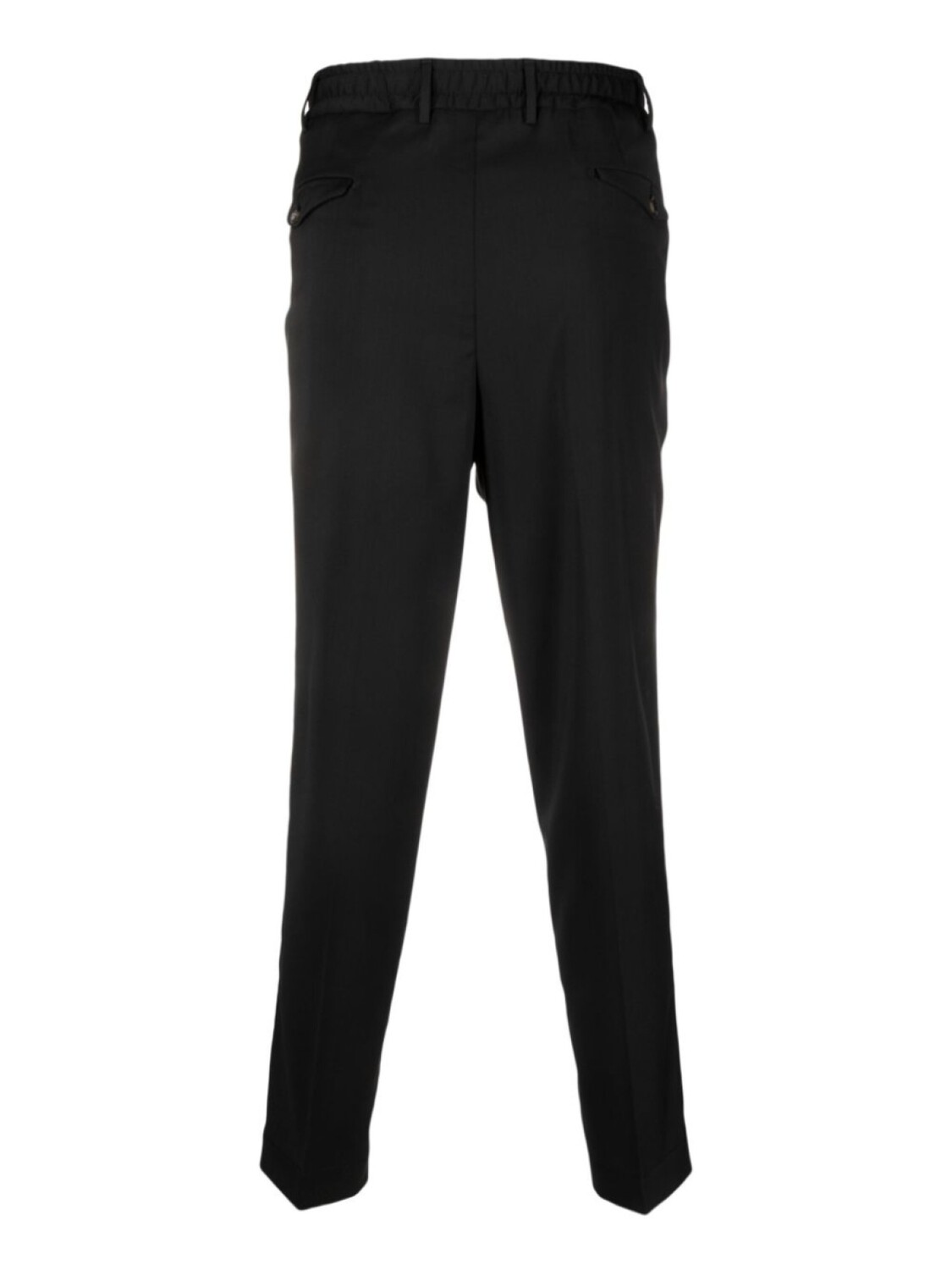Черный, шерсть, складки, потайная застежка на молнии и пуговицах, петли для ремня, прямой крой, два прорезных кармана по бокам и два кармана на пуговице сзади.