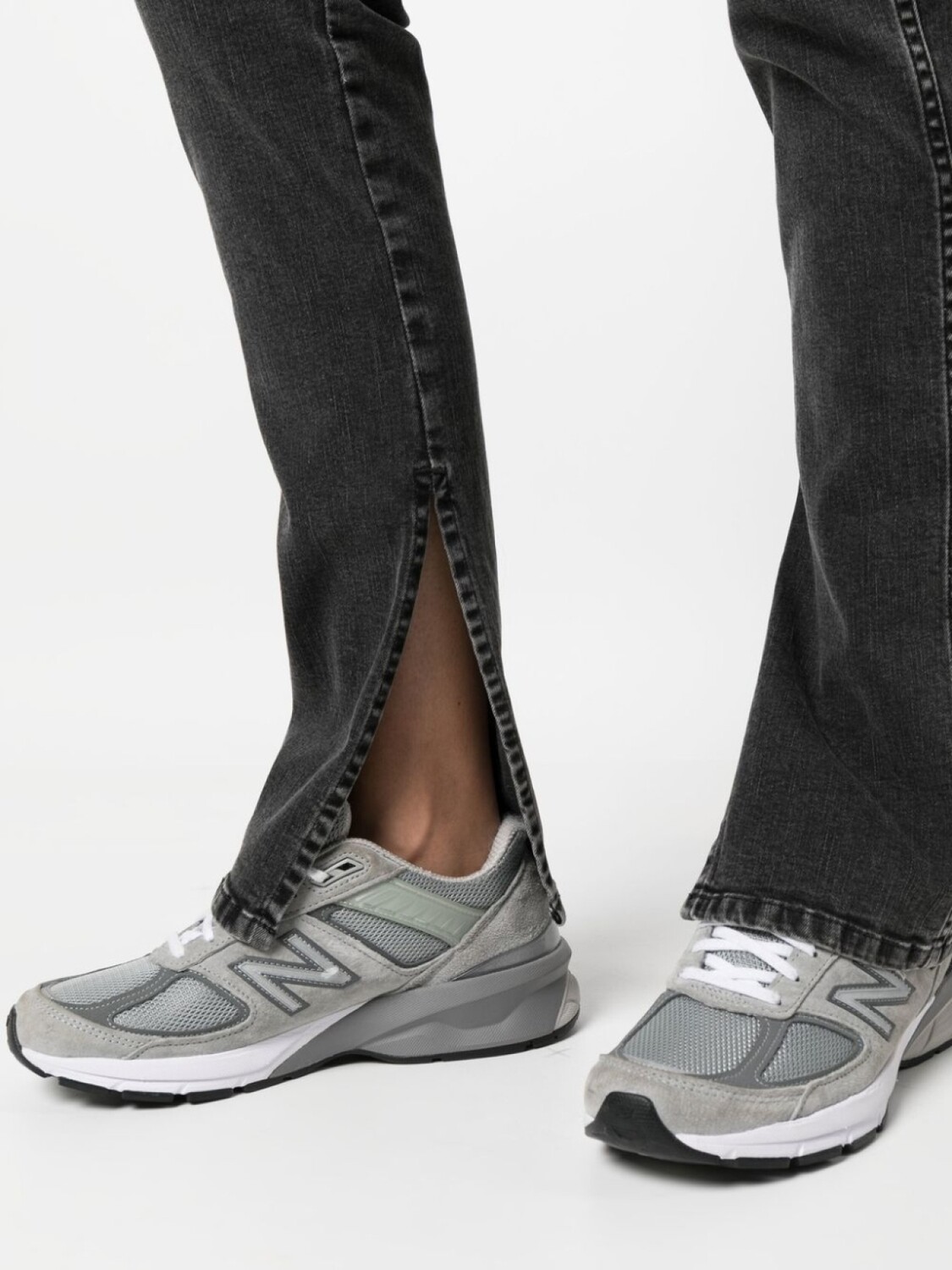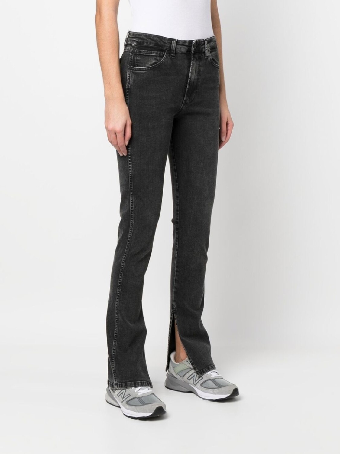 Темный оттенок денима, боковые разрезы, петли для ремня, застежка на молнии и пуговице спереди, пять карманов и облегающий крой.