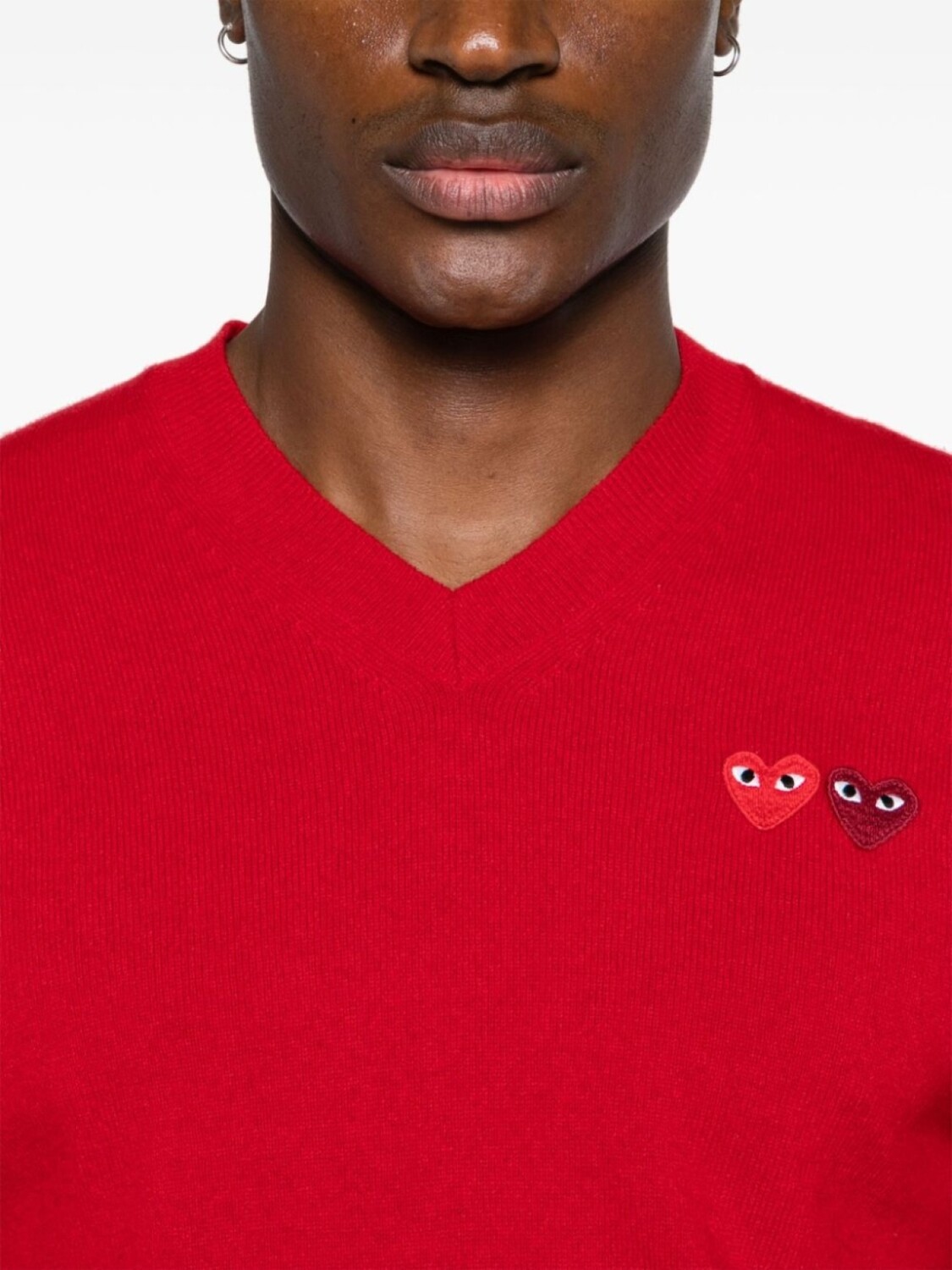Ярко-красный, шерсть, вязаный дизайн, нашивка с логотипом в форме сердца, V-образный вырез в рубчик, длинные рукава, подол и манжеты в рубчик, Это унисекс-модель. Обратите внимание, что для нее используется мужская размерная сетка.