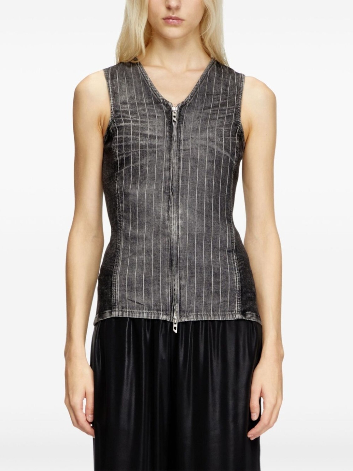 Темно-серый спереди застежка-молния с двумя бегунками узор в вертикальную полоску без рукавов