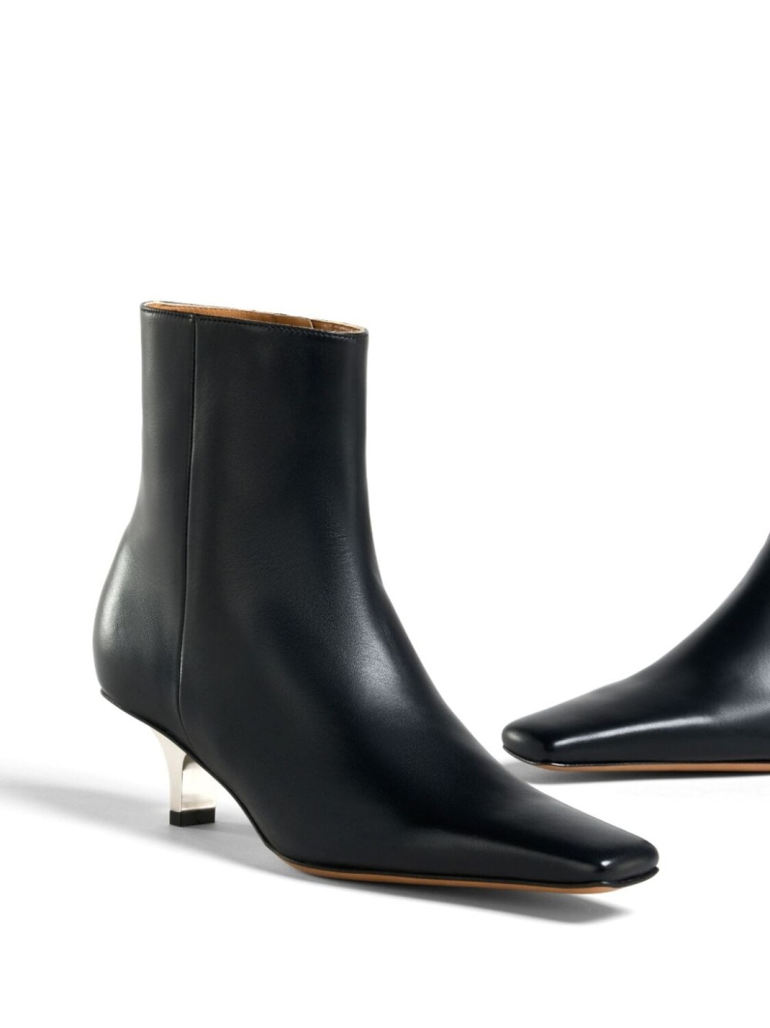 Черный, телячья кожа, козья кожа, заостренный носок, застежка на молнии сбоку и каблук-рюмка.
