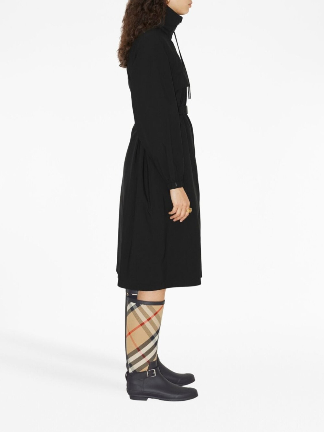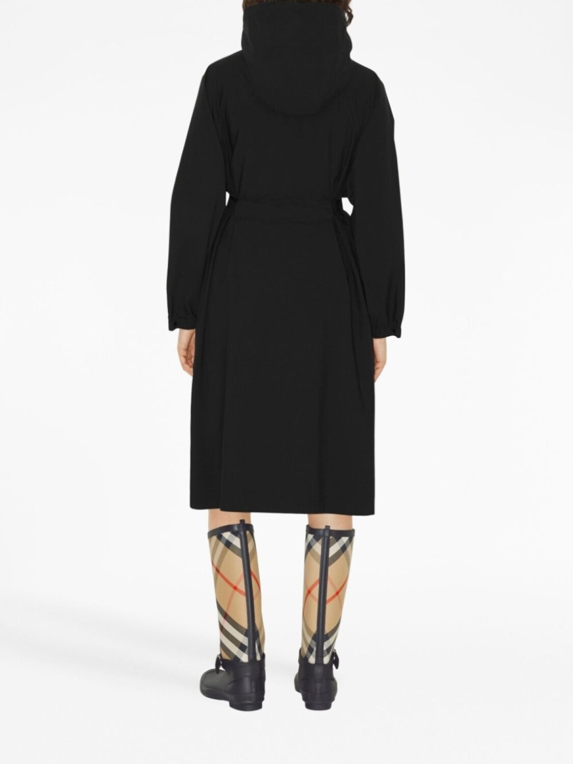 Черный, знаковый узор Equestrian Knight, потайной капюшон, высокий воротник, двусторонняя молния спереди, длинные рукава, эластичные манжеты, манжеты с застежкой на кнопки, ремень на талии, двусторонняя молния сбоку и прямой подол.