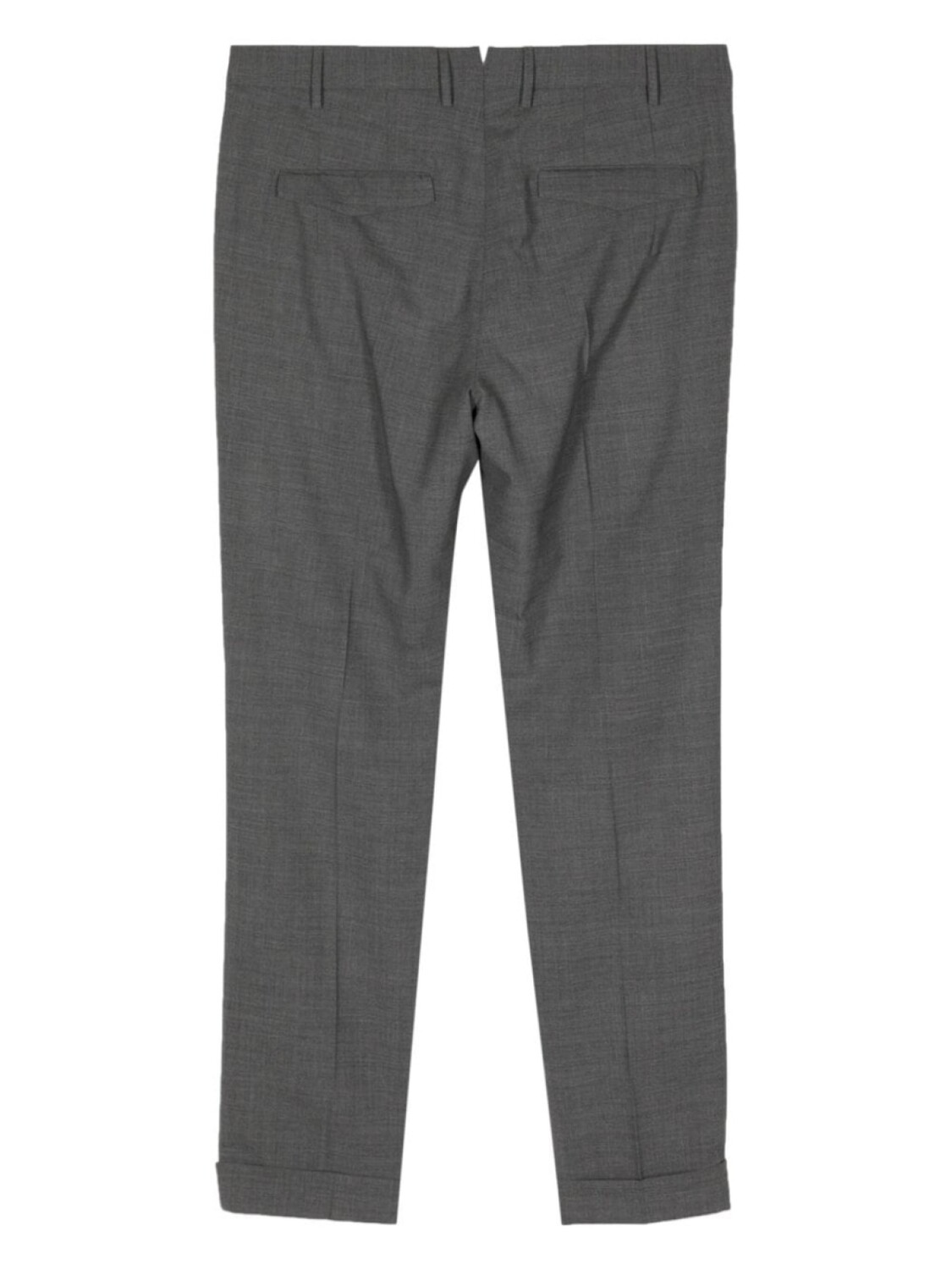 Темно-серый, вирджинская шерсть, эластичный материал, средняя посадка, петли для ремня, потайная застежка спереди, два прорезных кармана по бокам, два кармана с листочкой сзади, стрелки, прямой крой