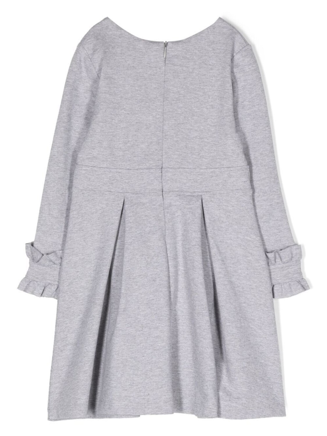Светло-серый, хлопок, вставки с оборками, планка на пуговицах спереди, круглый вырез, длинные рукава, потайная застежка на молнии сзади, складки, расклешенный крой и прямой подол.