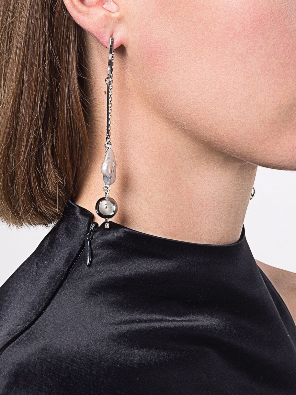Родиевое покрытие, вставки из пресноводного жемчуга, глянцевое покрытие, декор из кристаллов и для проколотых ушей. В комплект входят две серьги.