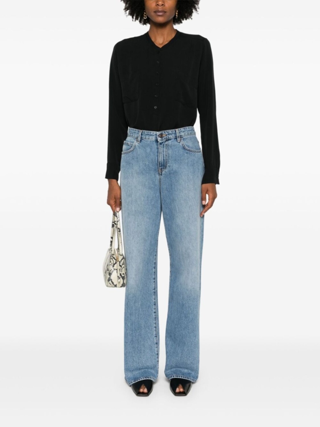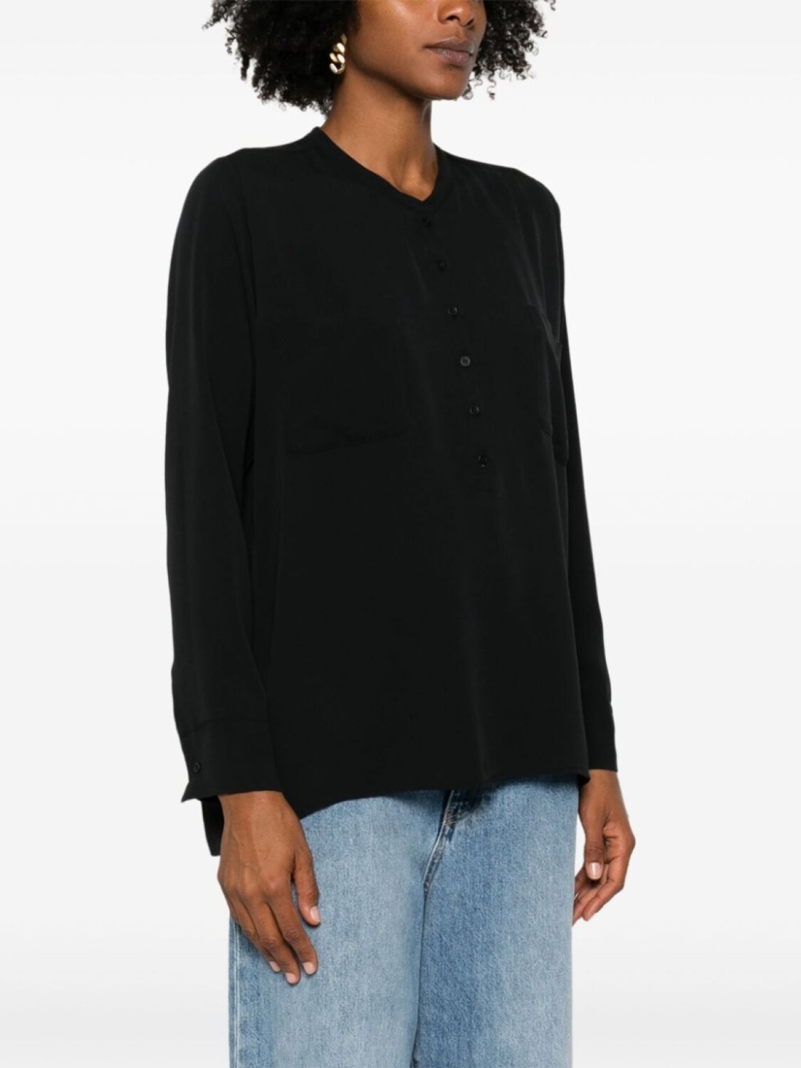 Черный, шелк, планка на пуговицах спереди, воротник-стойка, длинные рукава, манжеты на пуговицах, два накладных кармана на груди, прямой подол