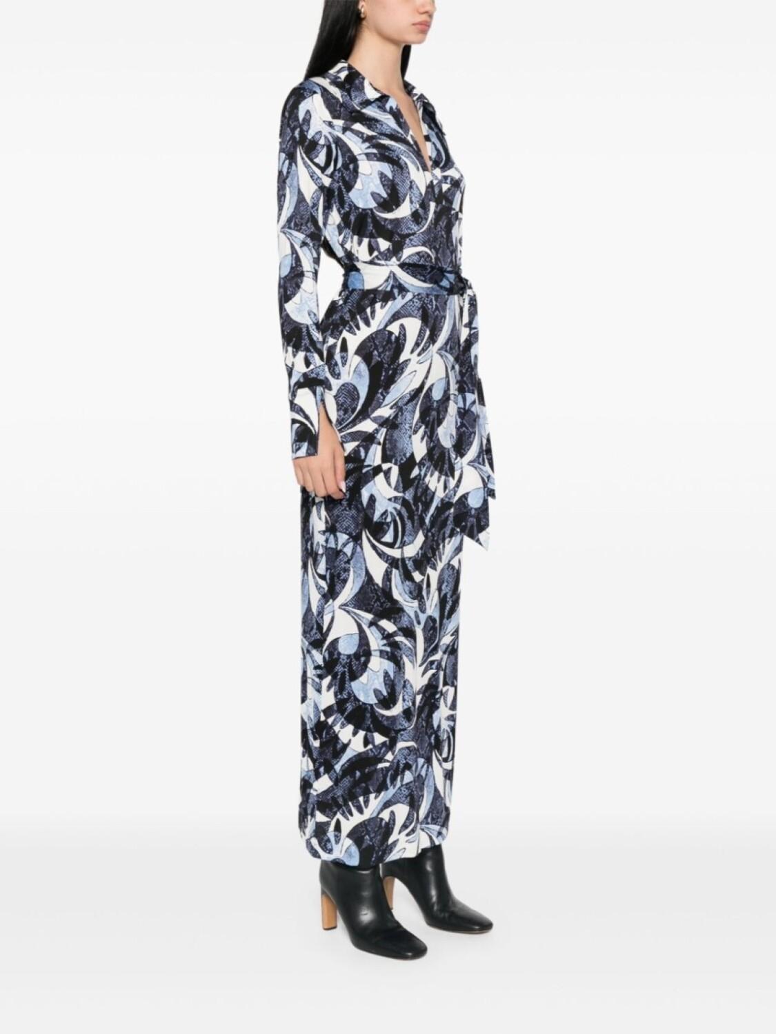 Синий/белый, эластичное джерси, съемный регулируемый ремень на талию, абстрактный принт, классический воротник, V-образный вырез, длинные рукава, манжеты с разрезами, петли для ремня, вырез сзади, модель без подкладки, прямой подол, длинная модель