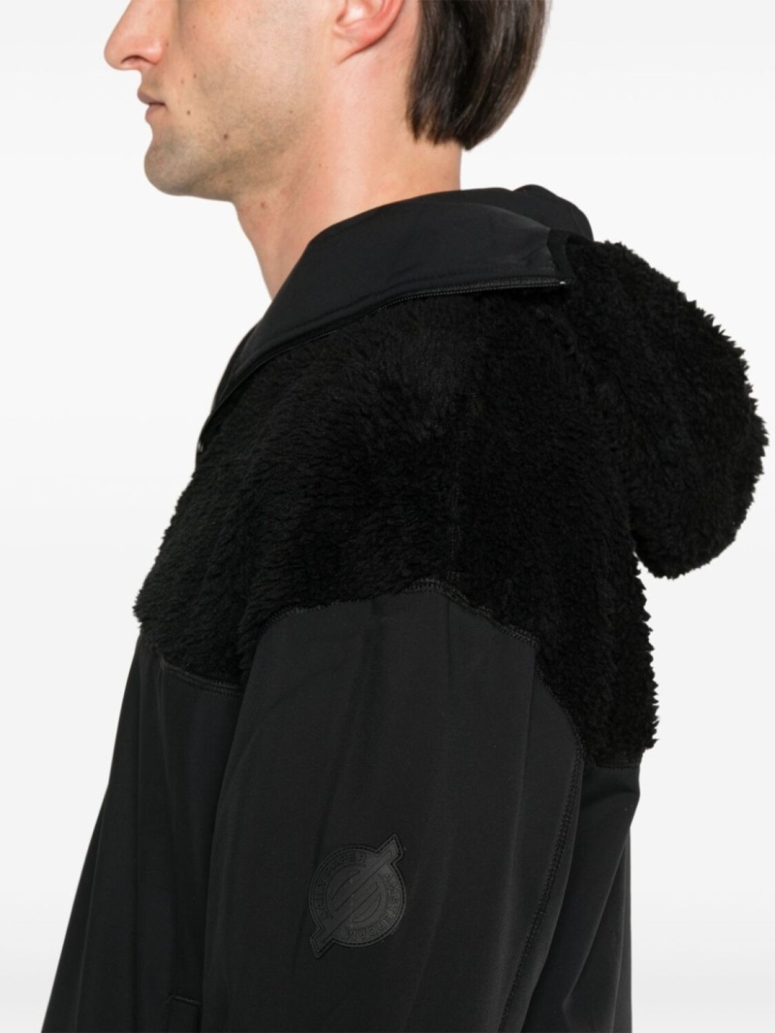 Черная застежка-молния спереди на половину длины, две застежки на кнопки, боковые карманы, сетчатая подкладка, нашивка с логотипом на рукаве