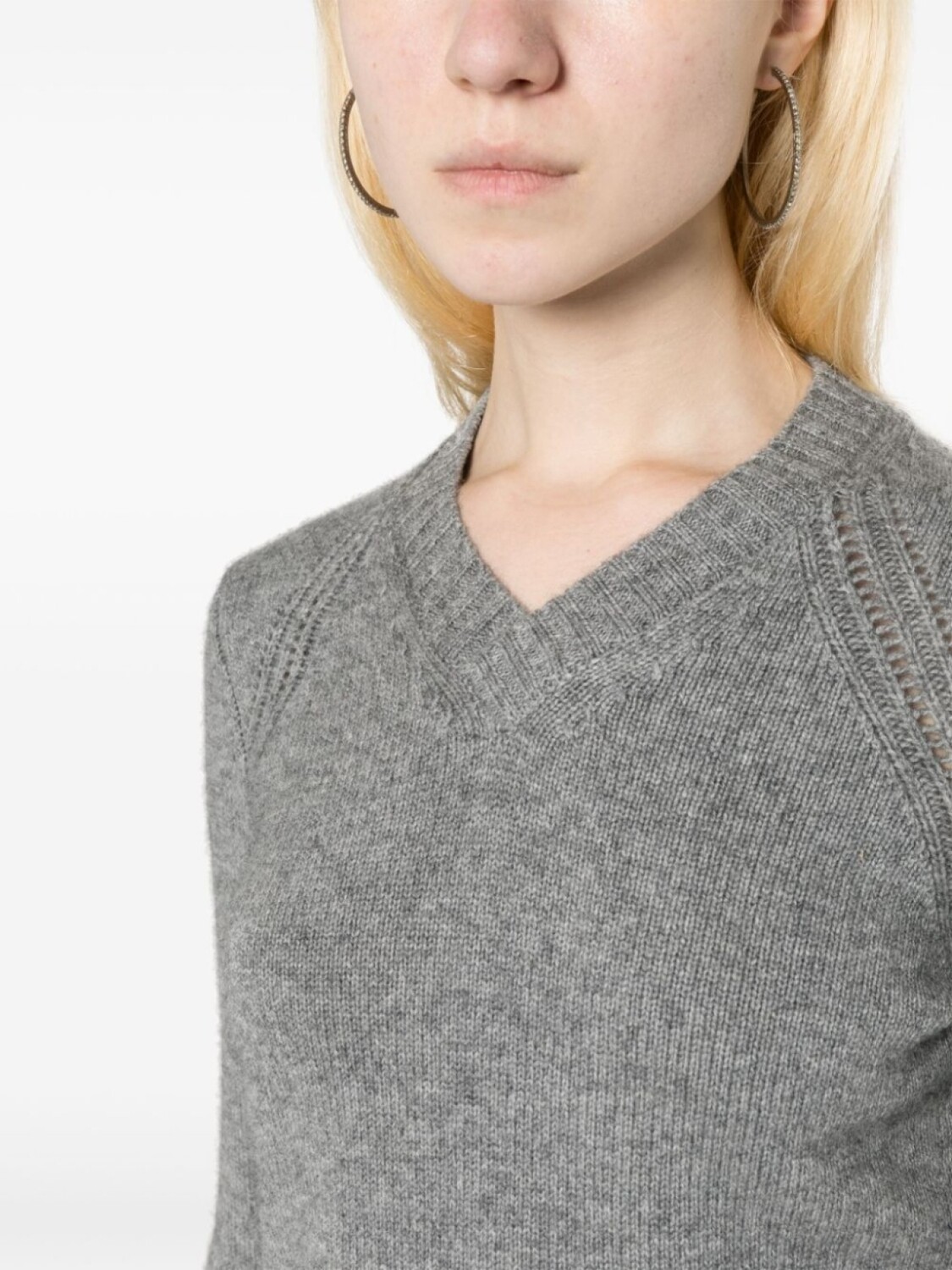 Серый, смесь шерсти и кашемира, тонкая вязка, ажурная вязка, декоративная строчка, V-образный вырез, длинные рукава реглан, подол и манжеты в рубчик, прямой подол