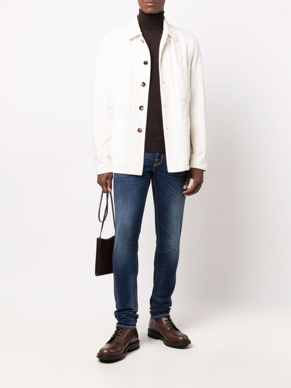 Тонкая вязка, детали в рубчик, высокий воротник, длинные рукава и прямой подол. Цвет: коричневый.