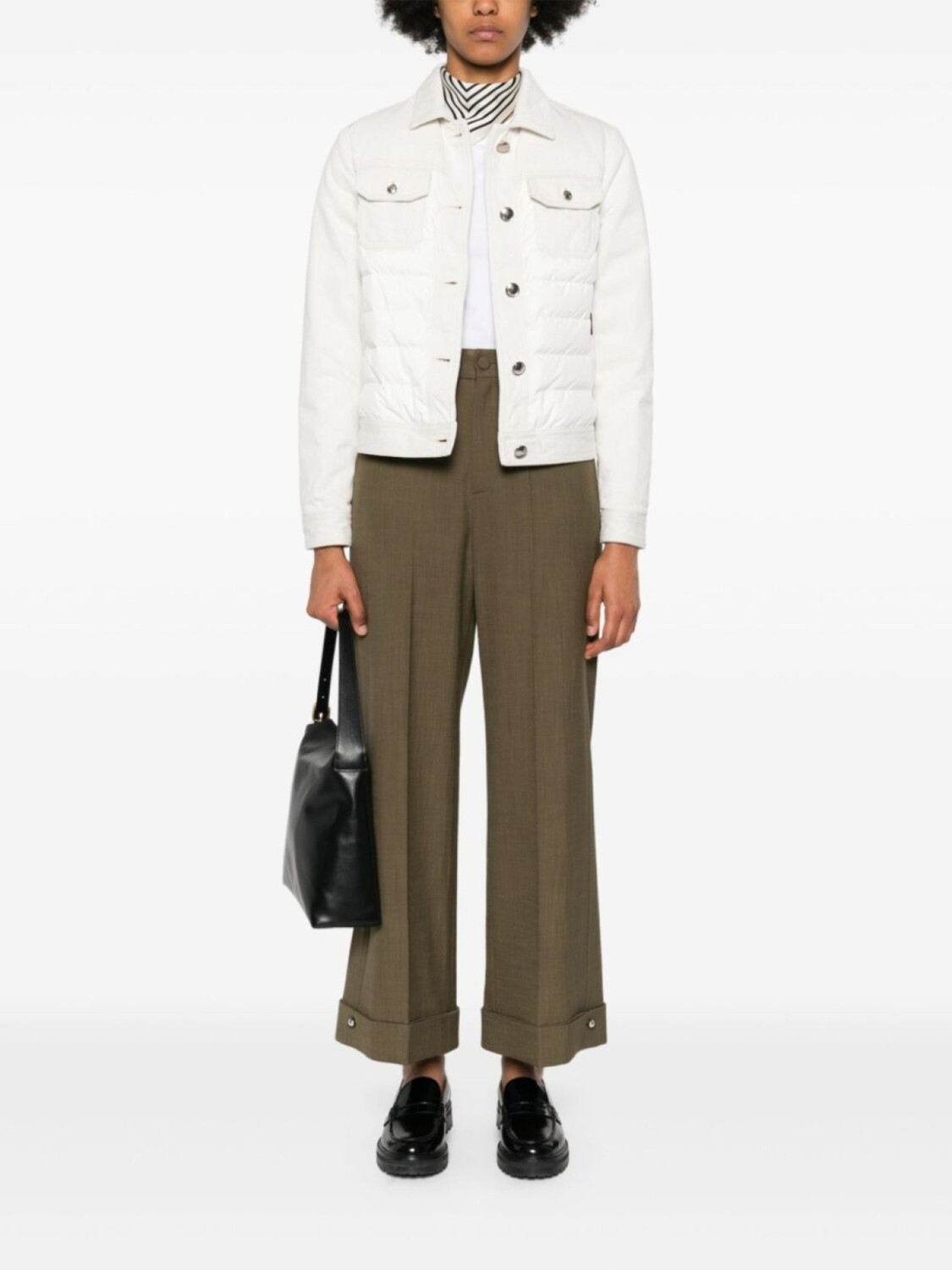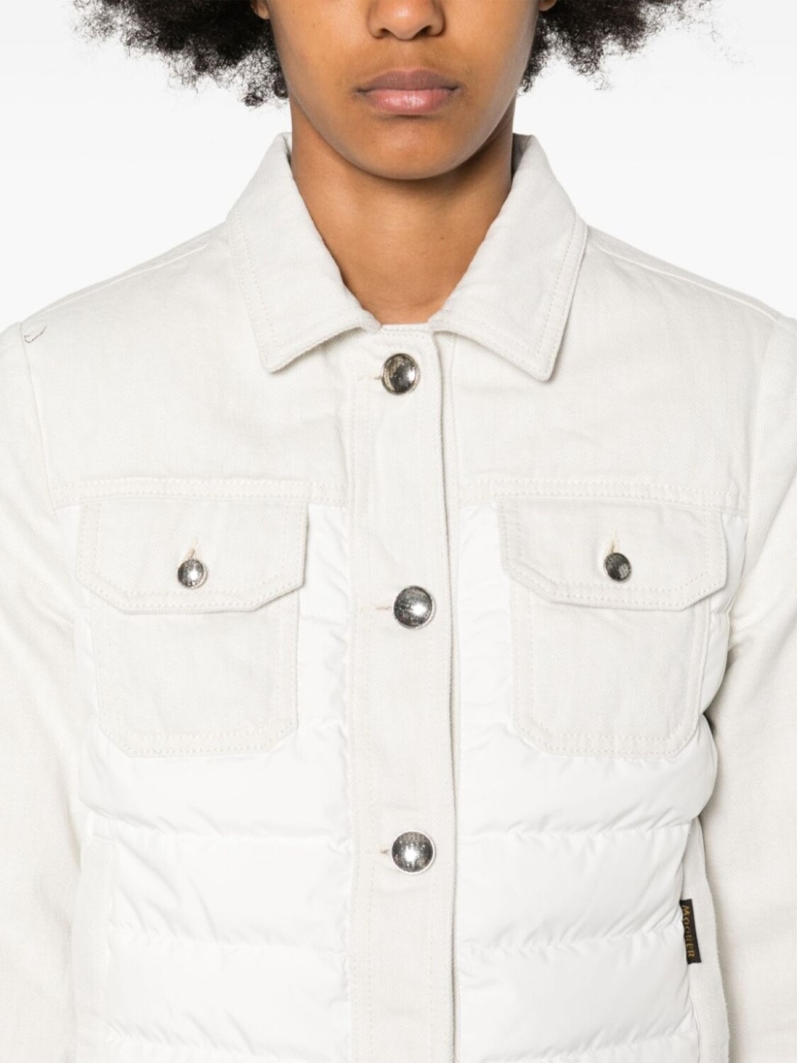 Подробнее о товаре: • экрю • хлопок • дутый материал • наполнитель из смеси пуха и пера • дизайн со вставками • тональная строчка • отложной воротник • длинные рукава с манжетами на пуговицах • два нагрудных кармана с клапанами • два кармана на молнии по бокам • логотип спереди • регулируемые ремешки на поясе • прямой подол • цельная подкладка • застежка на пуговицах спереди