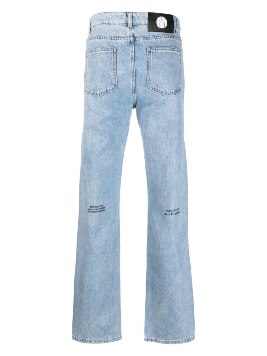 Голубой, хлопок, нашивка с логотипом сзади, логотип спереди, текстовый принт, петли для ремня, застежка на молнии и пуговице спереди, пять карманов и прямой крой.