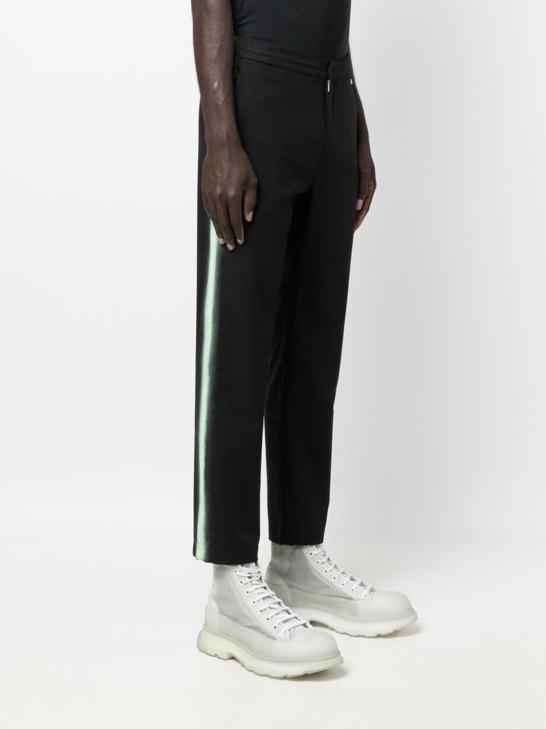 Черный, смесовый хлопок, средняя посадка, прямой крой, укороченная длина, полоска сбоку, потайная молния спереди, эластичный пояс, два прорезных кармана по бокам, два кармана с листочкой сзади и прямой подол.