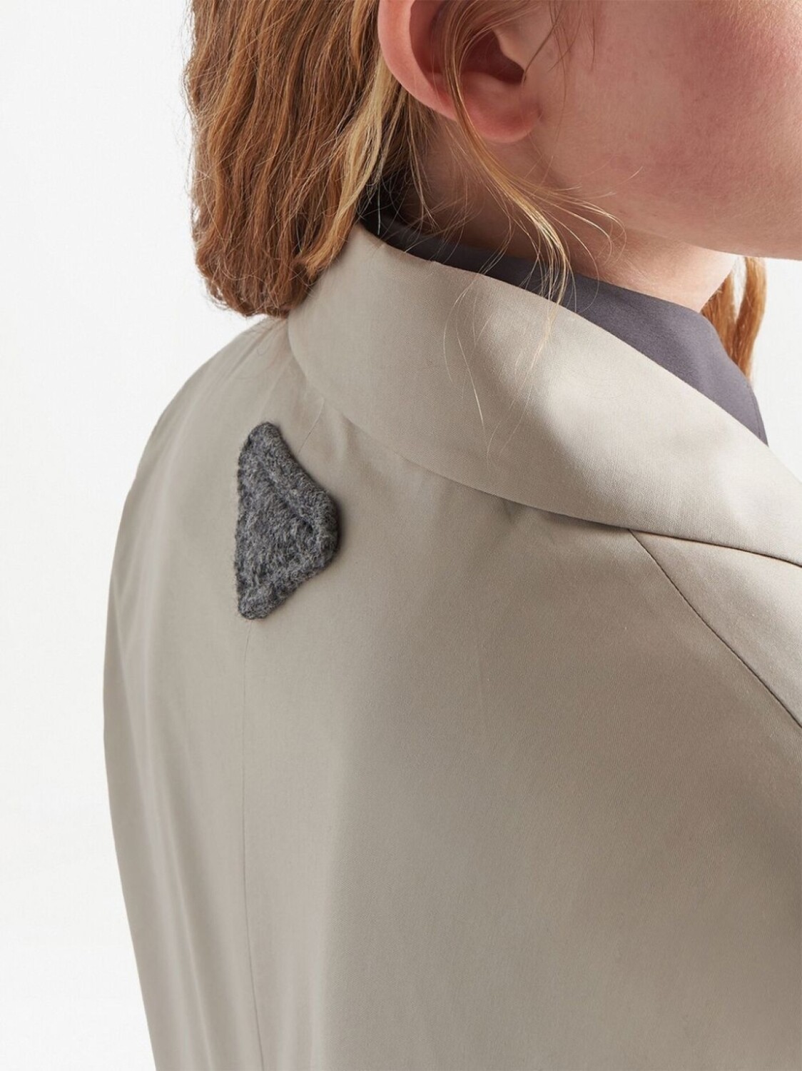 Светло-бежевый, хлопок, треугольный логотип, классические лацканы, застежка на пуговицах спереди, два прорезных кармана спереди, длинные рукава, длина миди и прямой подол.