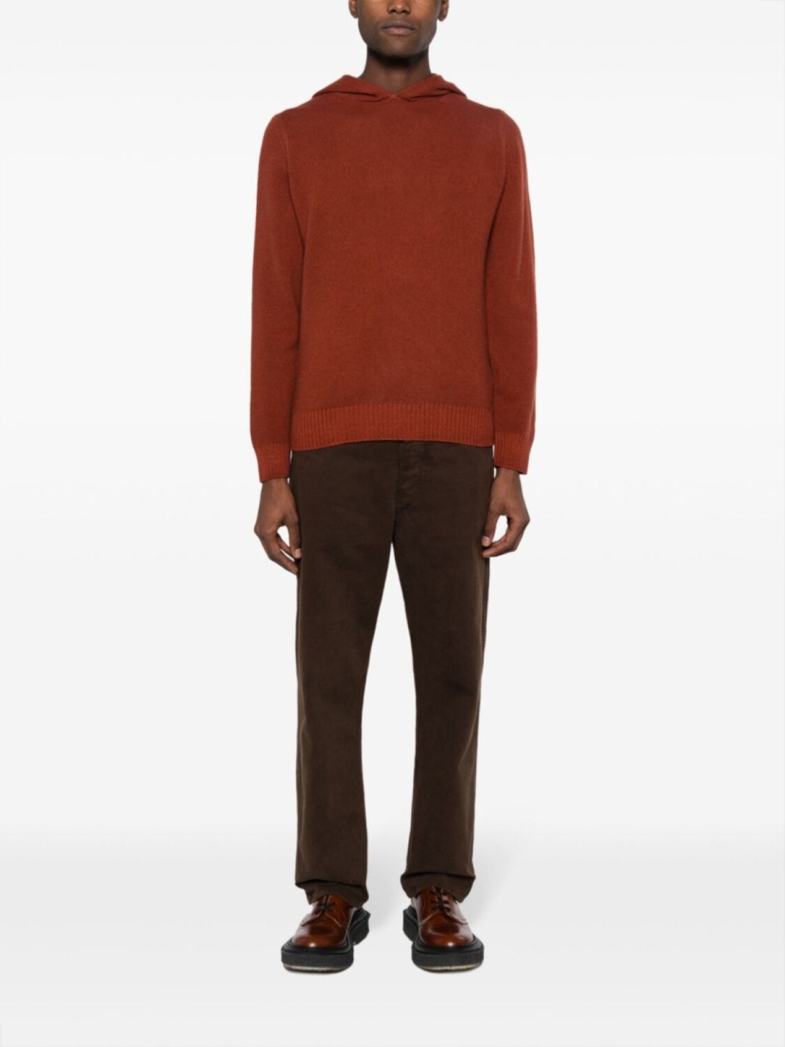 Темно-оранжевый, шерсть мериноса, смесовый кашемир, вязаные края в рубчик, классический капюшон, длинные рукава и прямой подол.