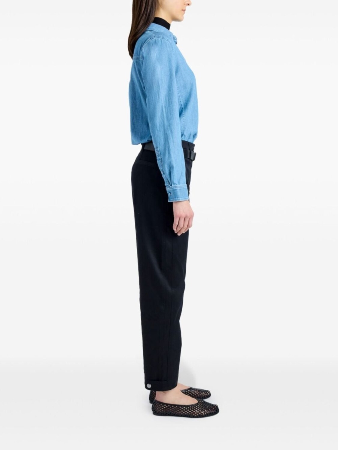 Черный эластичный хлопок саржевого переплетения, потайная застежка на пуговицы, высокая талия, шлевки для ремня, два прорезных кармана по бокам, два прорезных кармана сзади, прямой крой штанины, застежка на кнопки на щиколотках