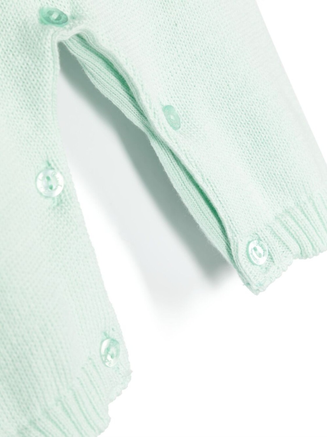 Мятно-зеленый, хлопок, кроше, круглый вырез, застежка на пуговицы сзади и короткие рукава.