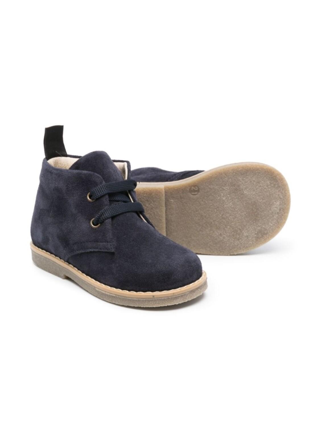 Темно-синий, замша из телячьей кожи, петля для подтягивания сзади, закругленный носок, шнуровка спереди, кожаная стелька с логотипом и резиновая подошва.