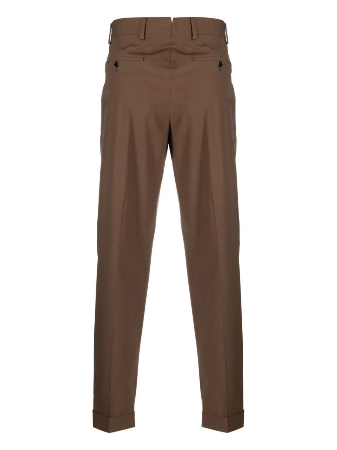 Расцветка Tobacco Brown, хлопок, защипы, зауженный крой, средняя посадка, потайная застежка на молнии и пуговицах, петли для ремня, прорезные карманы по бокам и два кармана на пуговице сзади.