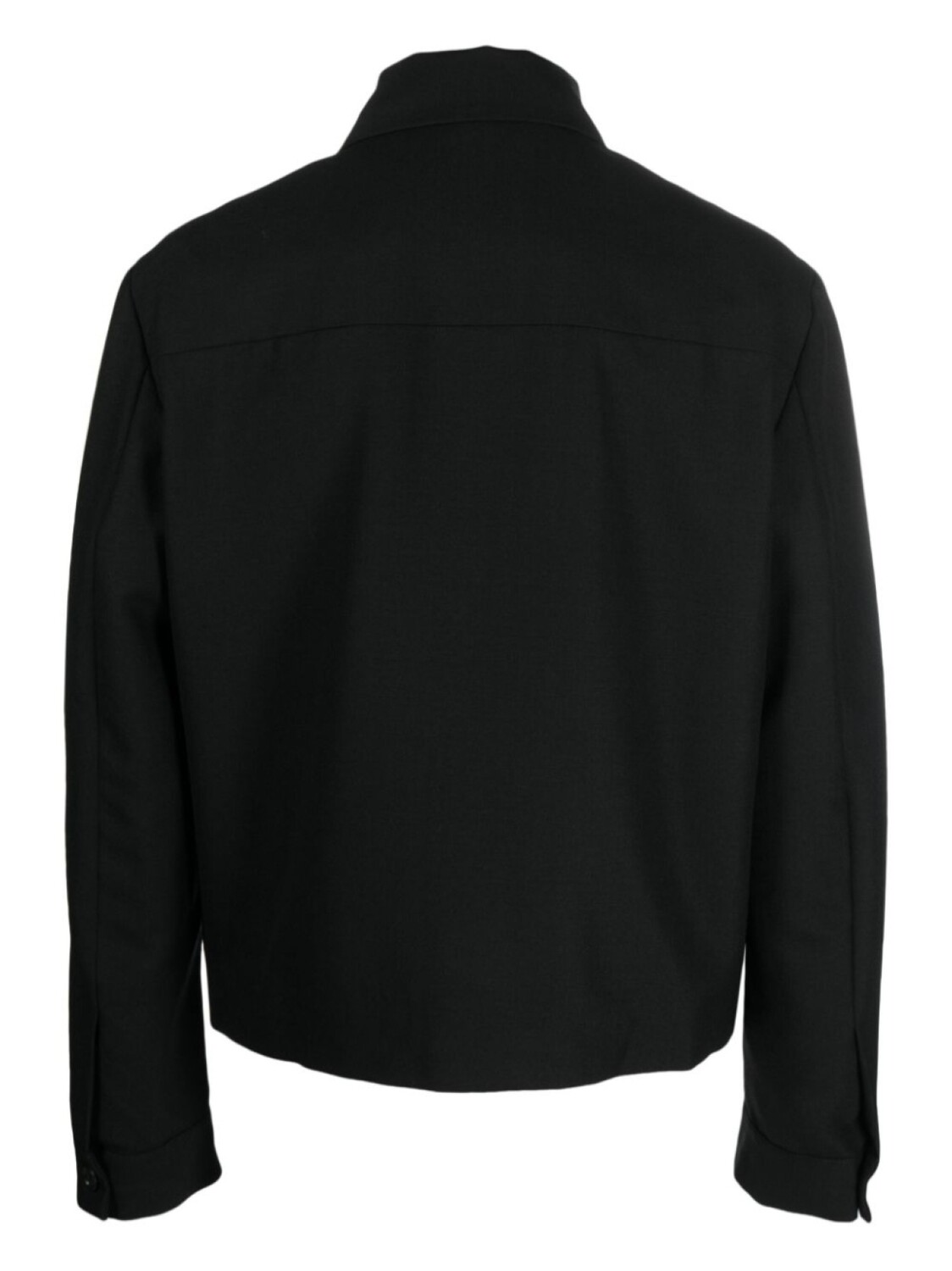 Черный, смесь шерсти и мохера, прямой воротник, застежка на молнии спереди, длинные рукава, два накладных кармана спереди и прямой подол.