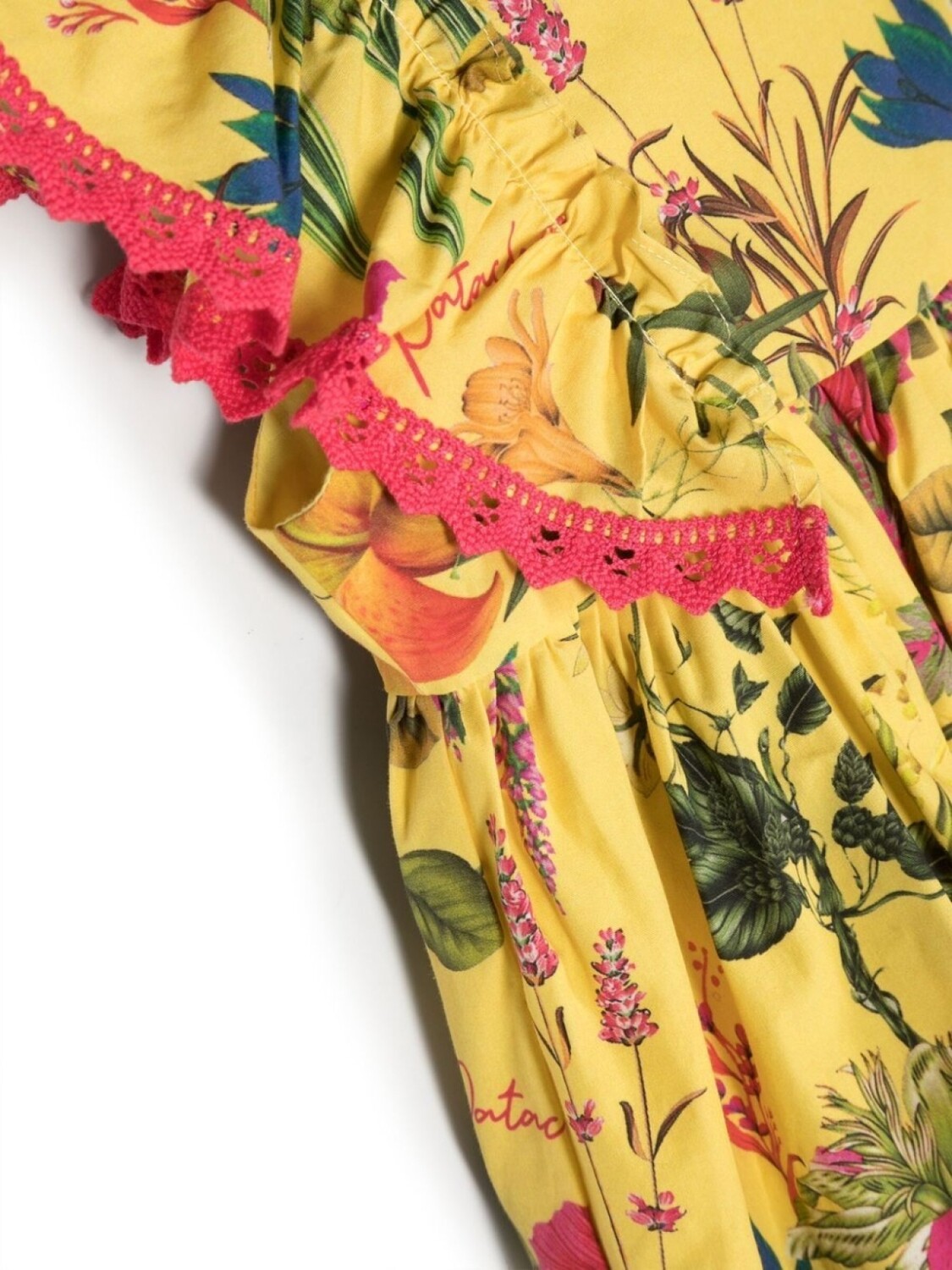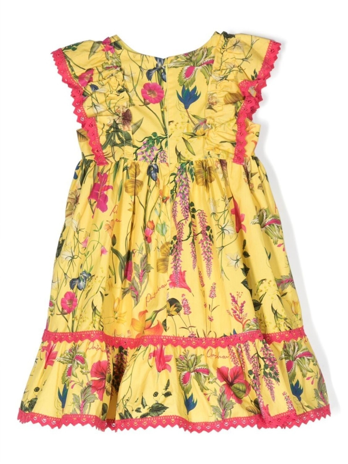 Хлопок, сплошной цветочный принт, расклешенный крой, круглый вырез, без рукавов, застежка на молнии сзади, вставки с оборками, кружевная отделка и подол с фестонами.