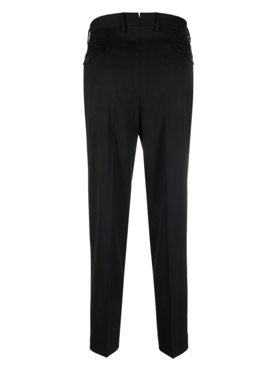 Черный, петли для ремня на поясе, два вшитых кармана по бокам, складки, два кармана на пуговице сзади, зауженный крой, потайная застежка на пуговицы, крючок и молнию спереди