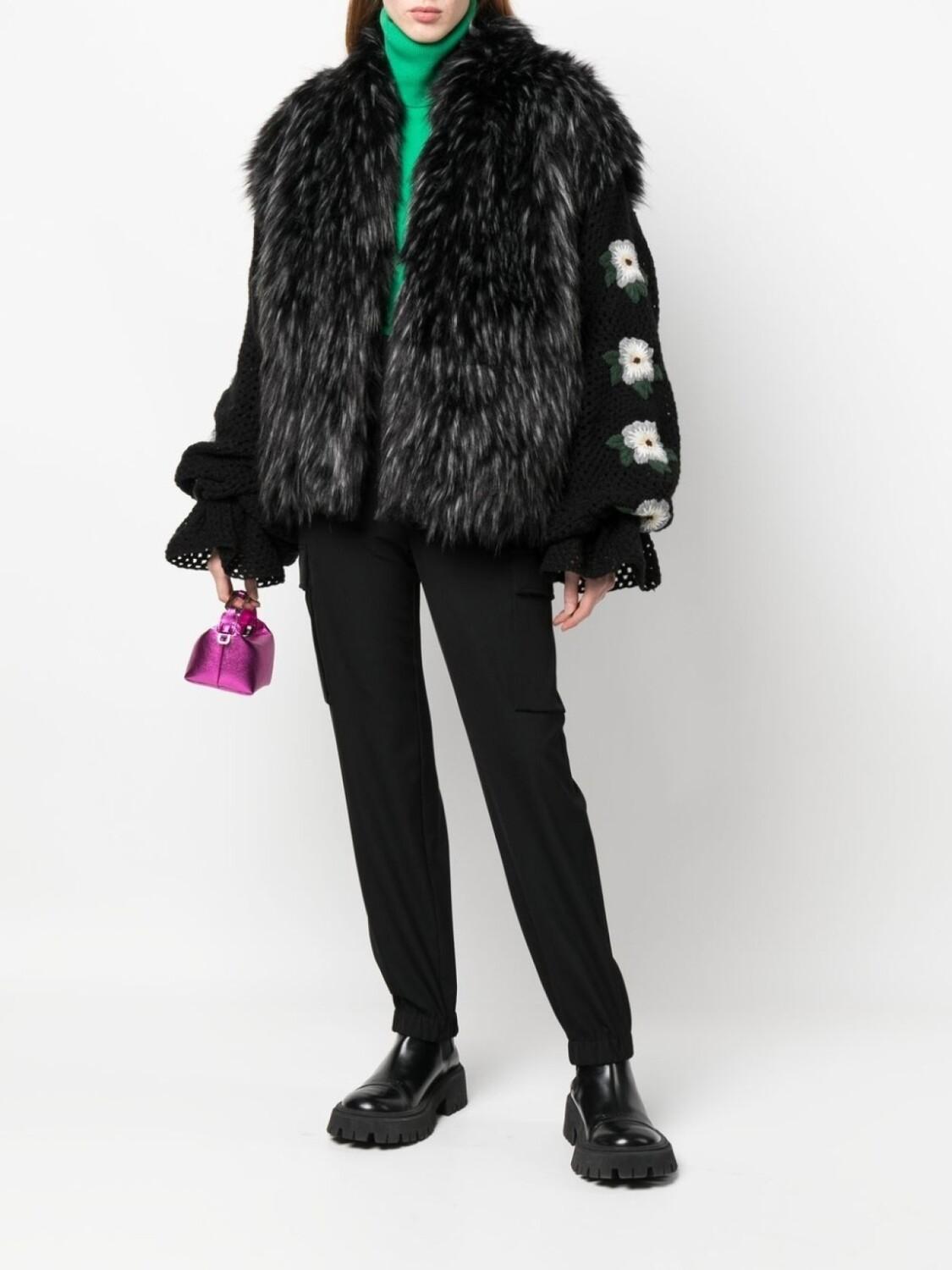 Черный, крупная вязка, цветочная вышивка, высокий воротник, длинные рукава и рукава с вырезами.