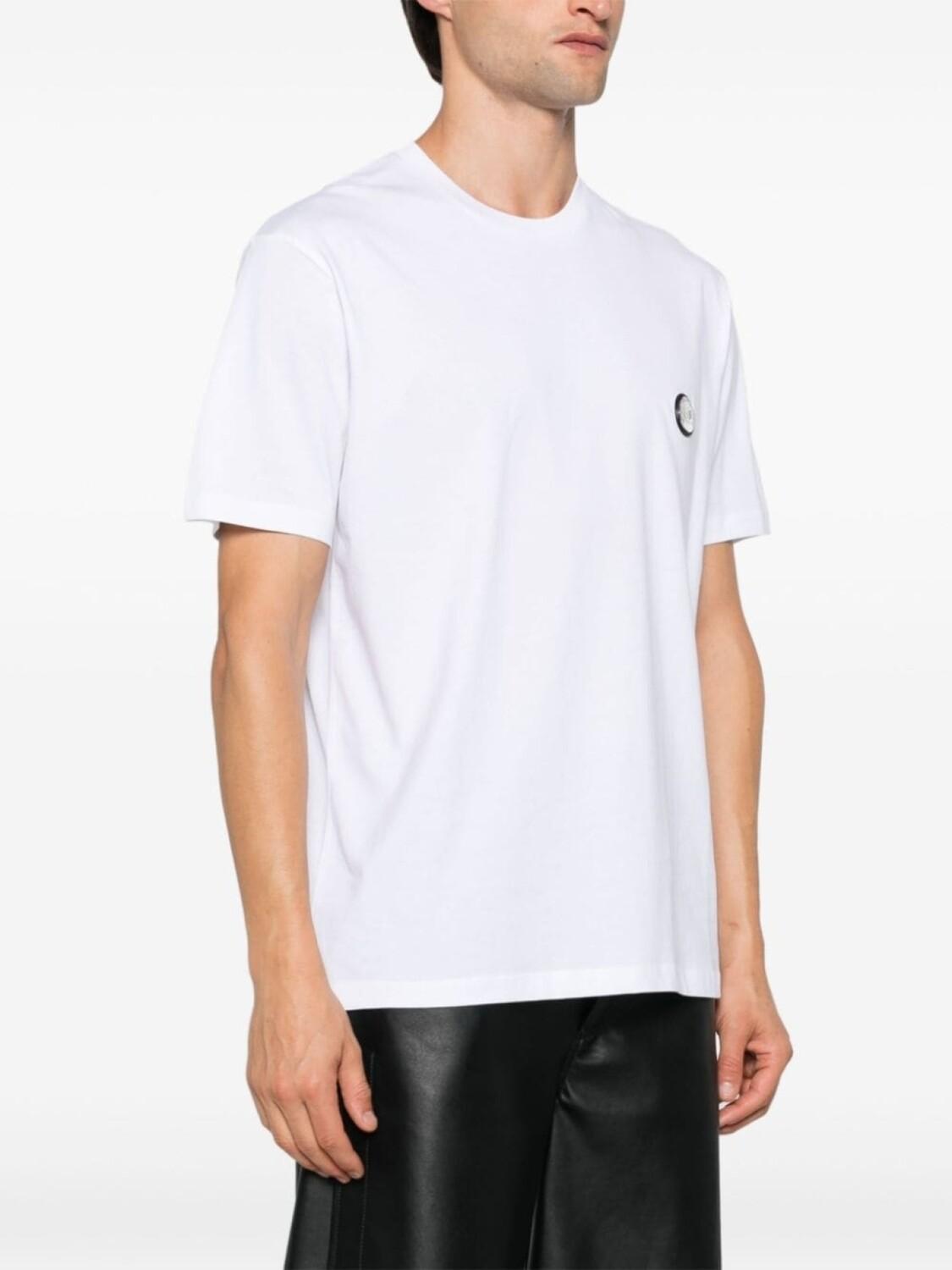 Белый, хлопок, ткань джерси, круглый вырез, короткие рукава, серебристый металлический логотип, прямой подол