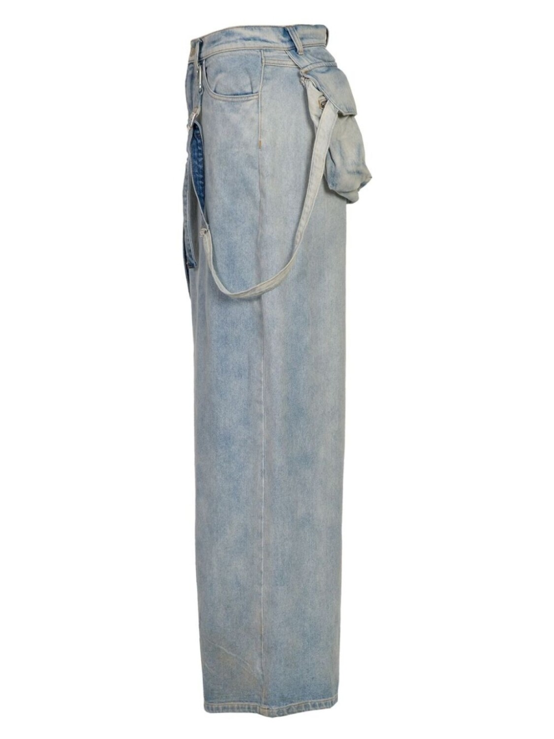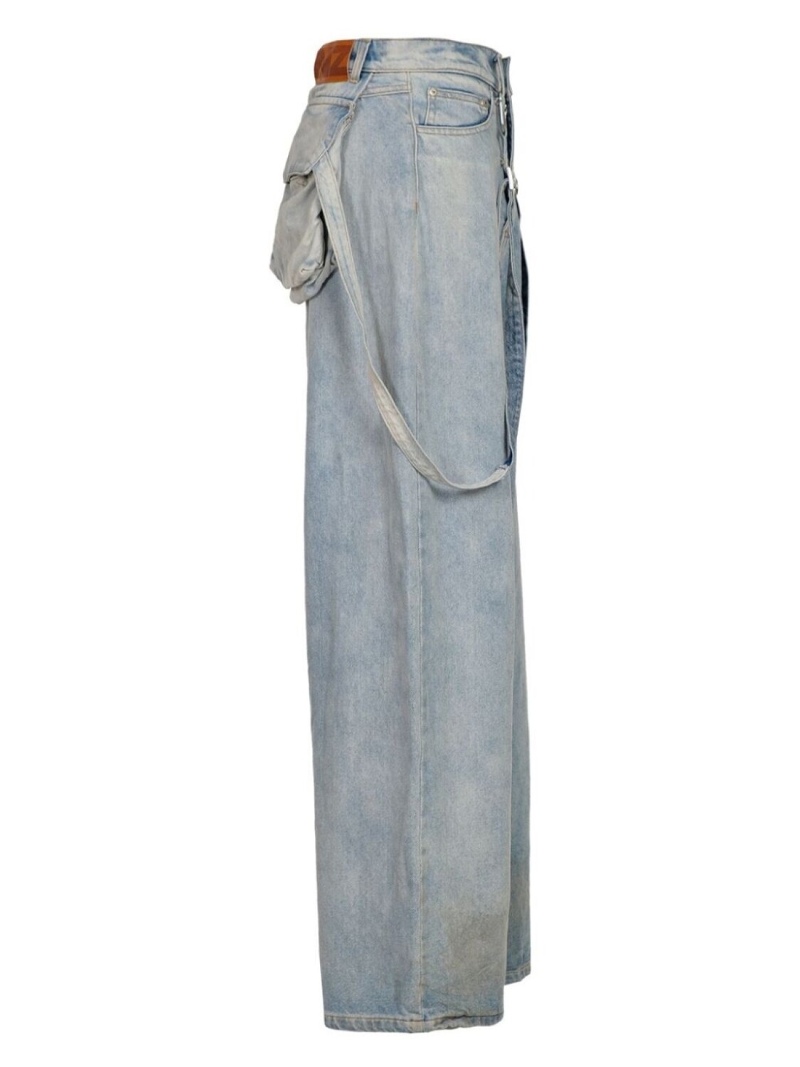 Синий хлопковый деним светло-коричневый застежка на молнию и пуговицы спереди шлевки для ремня пять классических карманов нашивка с логотипом сзади задний карман на молнии съемные лямки прямой подол При покупке этой вещи унисекс имейте в виду, что она классифицируется по стандартным мужским размерам.