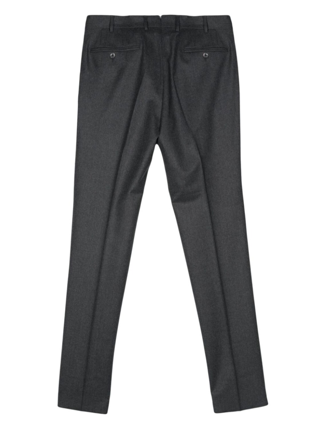 Антрацитово-серый, вирджинская шерсть, фетровый материал, петли для ремня, два прорезных кармана по бокам, стрелки, два кармана на пуговице сзади, зауженный крой, застежка на молнии и пуговице спереди