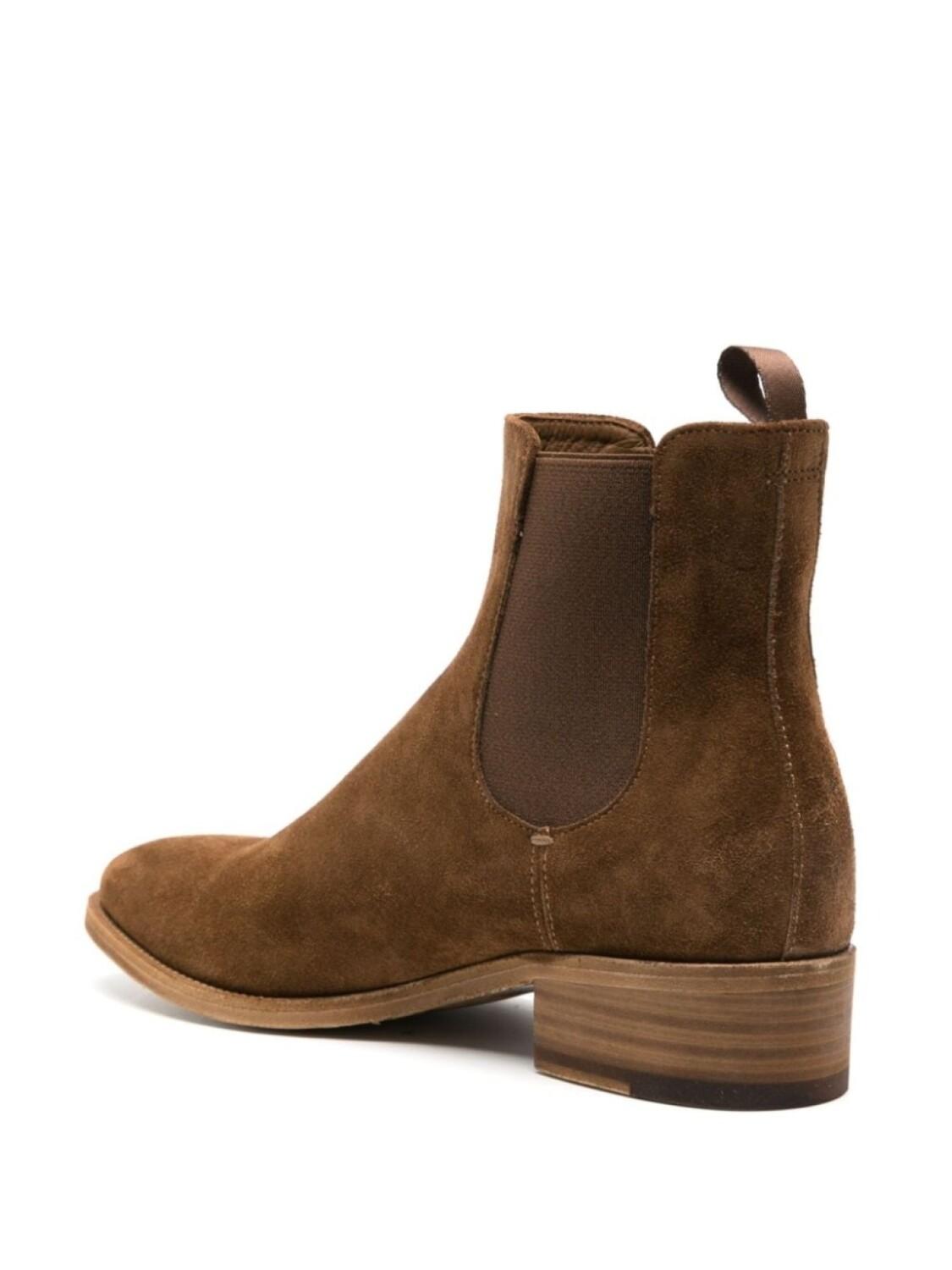 Бежево-коричневый, замша из телячьей кожи, вставки, строчка в тон, миндалевидный носок, высота по щиколотку, эластичные боковые вставки, петля для подтягивания сзади, стелька с логотипом, низкий блочный каблук и кожаная подошва.