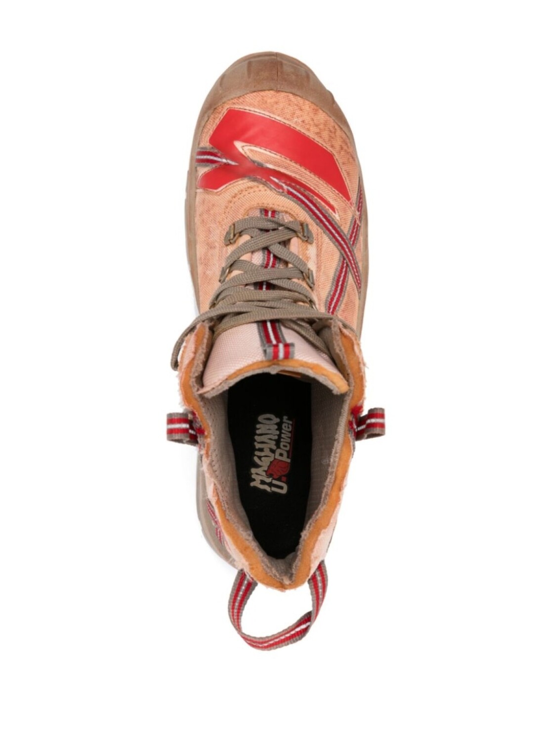 Коричневый/светло-бежевый/кирпично-красный, переплетенный дизайн, дизайн со вставками, эффект потертости, шнуровка спереди, длина по щиколотку, двойная петля для подтягивания, светоотражающие детали, логотип сбоку, резиновый носок, закругленный носок, сетчатая подкладка, стелька с логотипом, массивная резиновая подошва