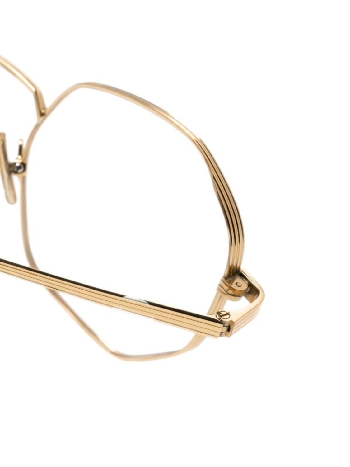 Золотистый, ацетат, оправа геометрической формы, прозрачные линзы, прямые дужки и дужки с закругленными концами. Обратите внимание, что на FARFETCH продаются оправы с линзами без диоптрий. В комплект входит защитный чехол для очков.