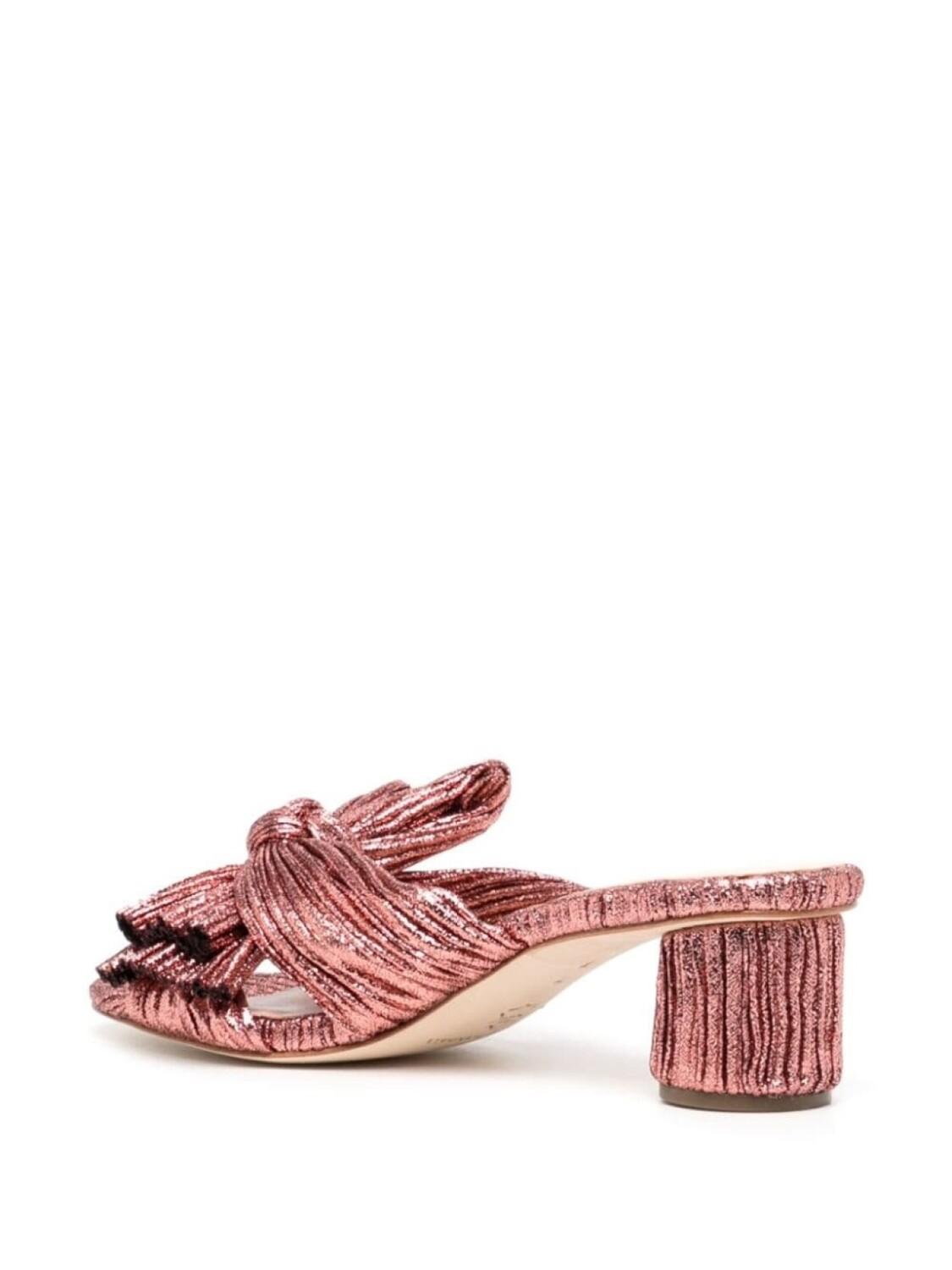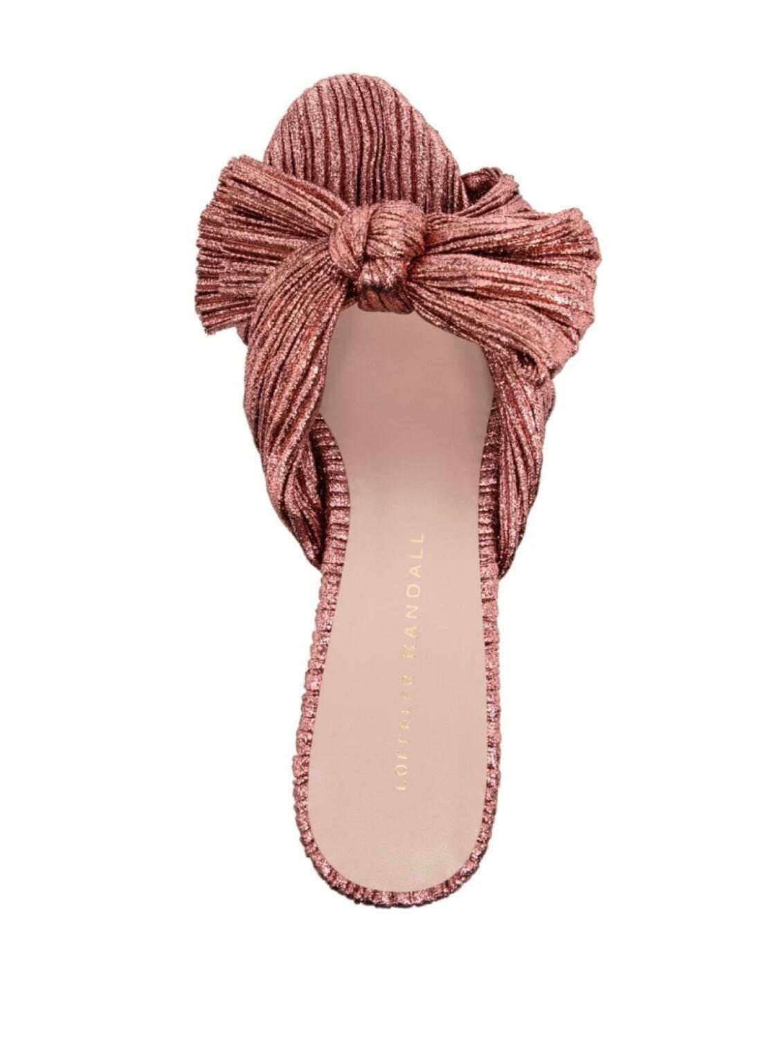 Коричнево-красный, эффект металлик, плиссированный материал, бант, открытый носок, открытая спина, модель без застежки и низкий блочный каблук. Узнать больше о том, какие товары получают отметку «Ответственный выбор», можно из материала «Как мы оцениваем экологичность и этичность».