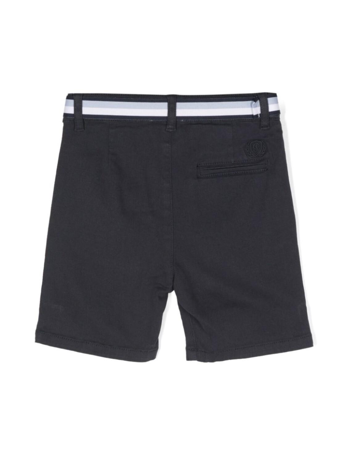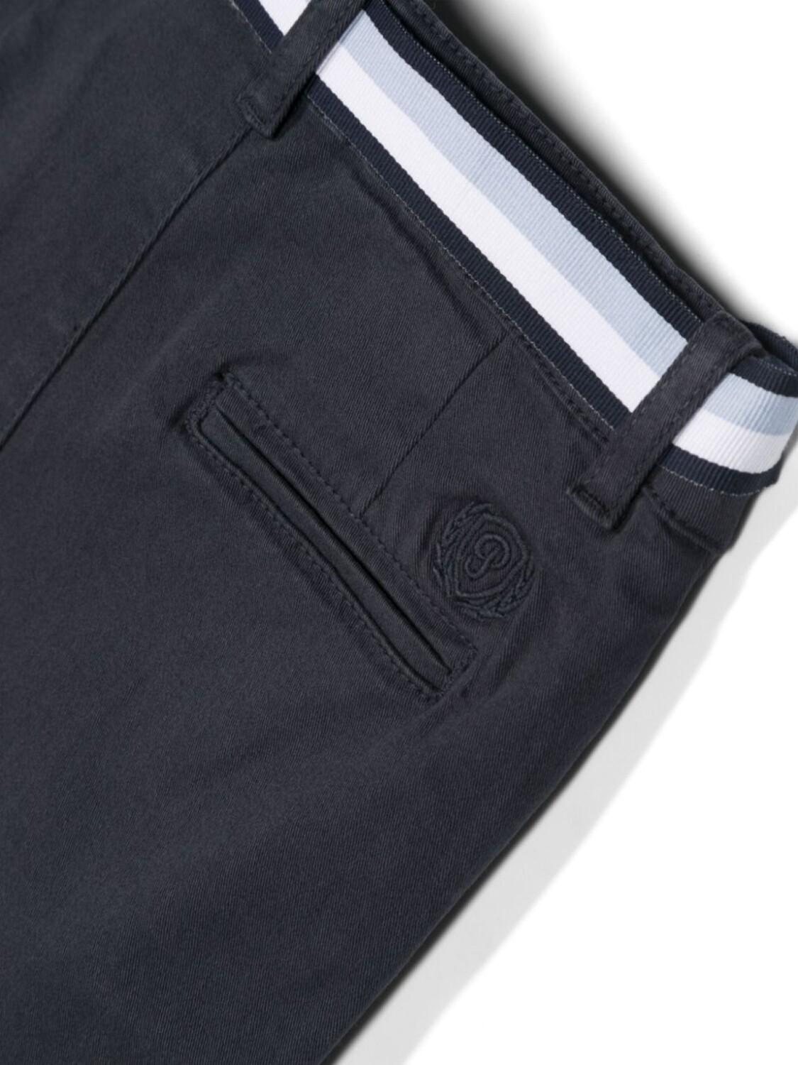 Темно-синий, смесовый хлопок, ткань с твиловым переплетением, петли для ремня, съемный регулируемый ремень на талию, два прорезных кармана по бокам, длина до бедер, прорезной карман сзади, потайная застежка на молнии и пуговицах спереди