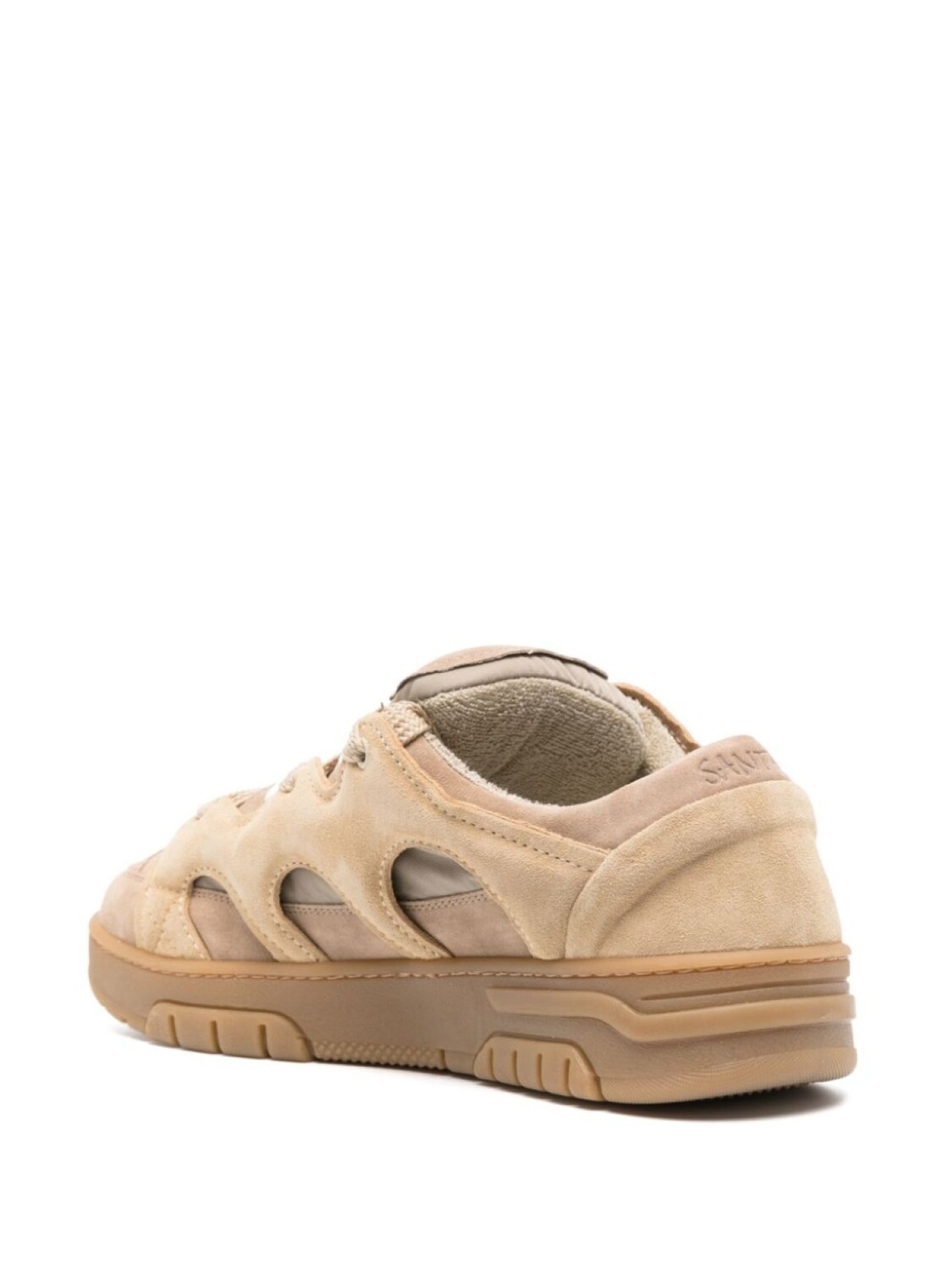 Песочно-бежевый, замша из телячьей кожи, лиф со вставками, тисненый логотип на язычке, тисненый логотип сзади, закругленный носок, шнуровка спереди, кожаная стелька с логотипом и резиновая подошва.