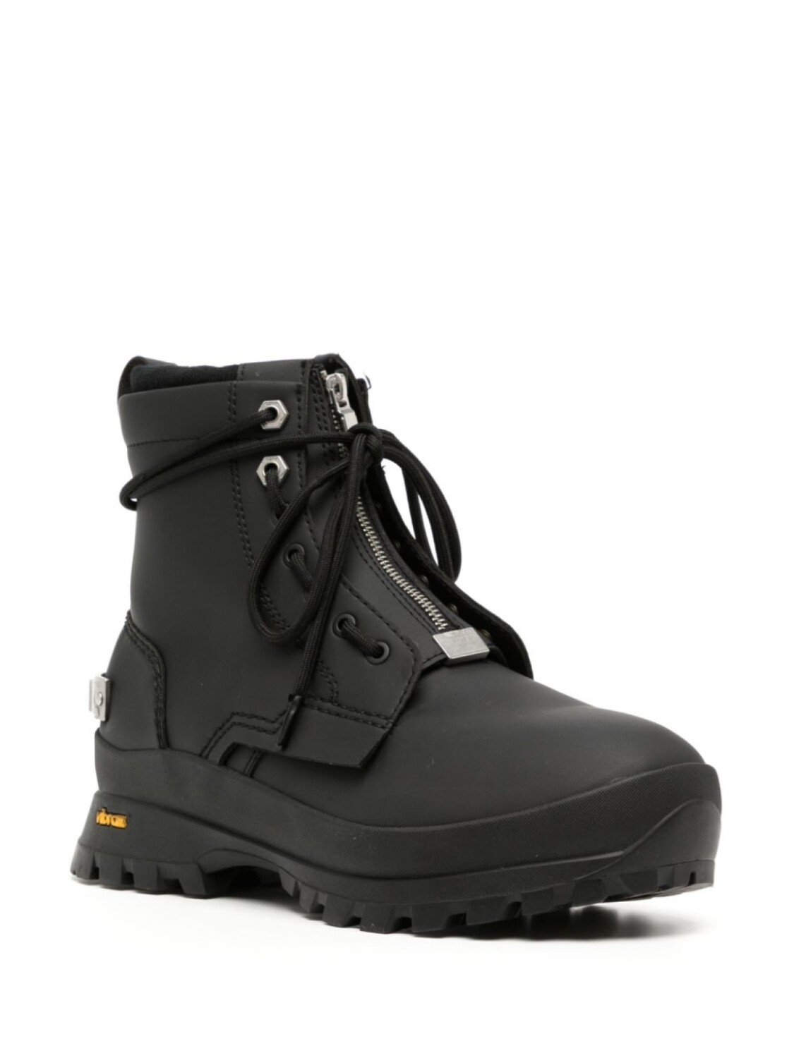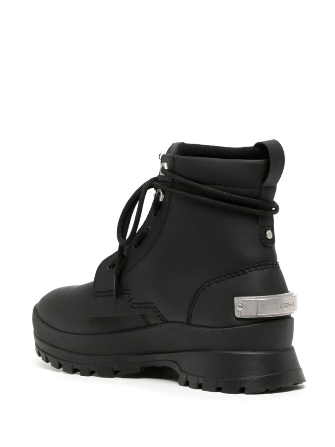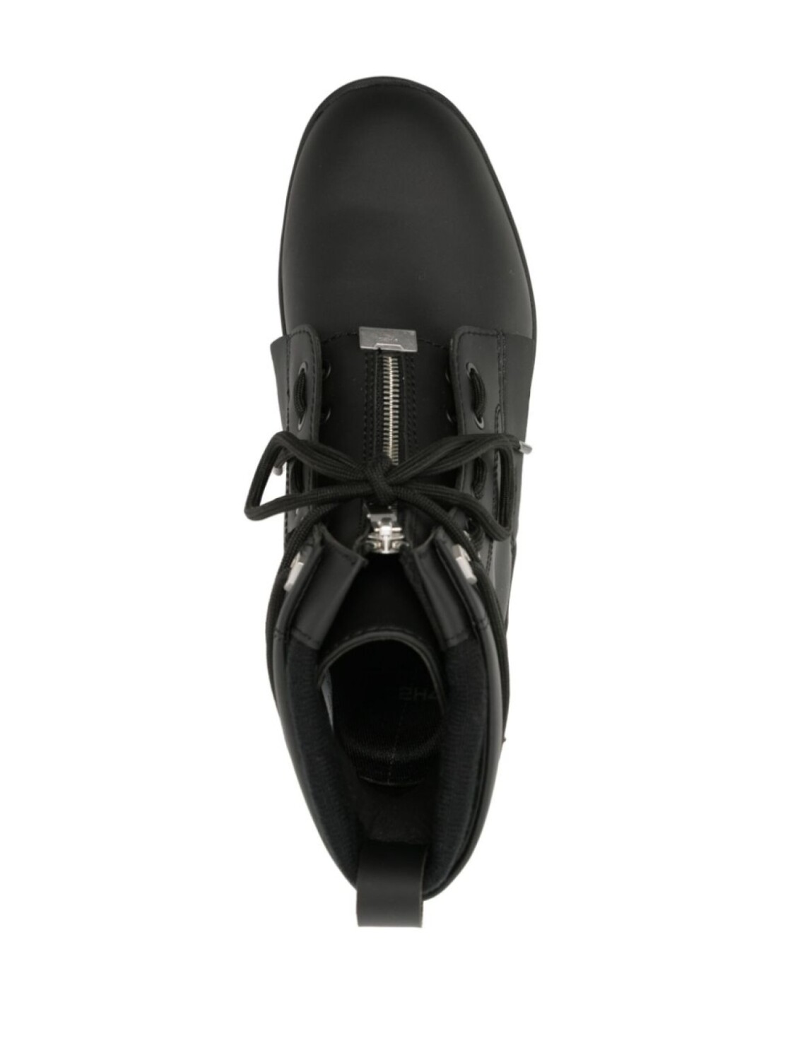 Черный, телячья кожа, вставки, строчка в тон, серебристый металлический логотип, закругленный носок, застежка на молнии спереди, шнуровка спереди, петля для подтягивания сзади, высота по щиколотку и рифленая резиновая подошва.