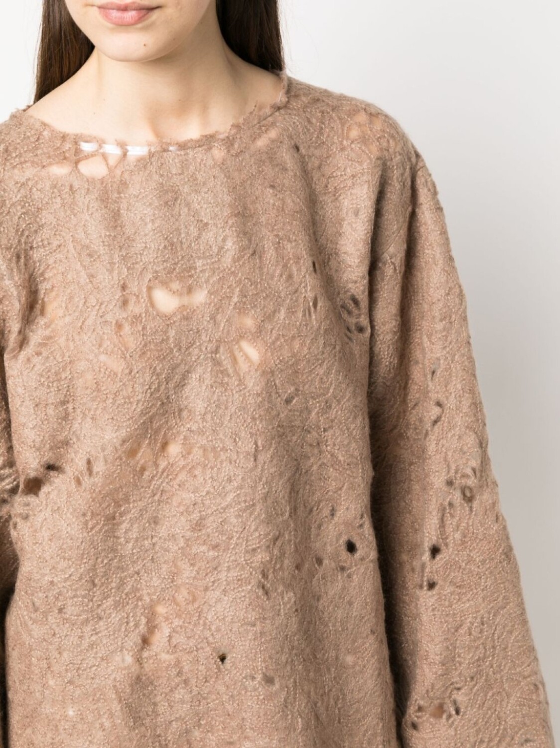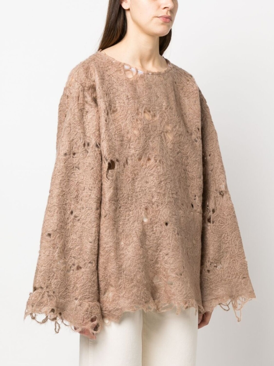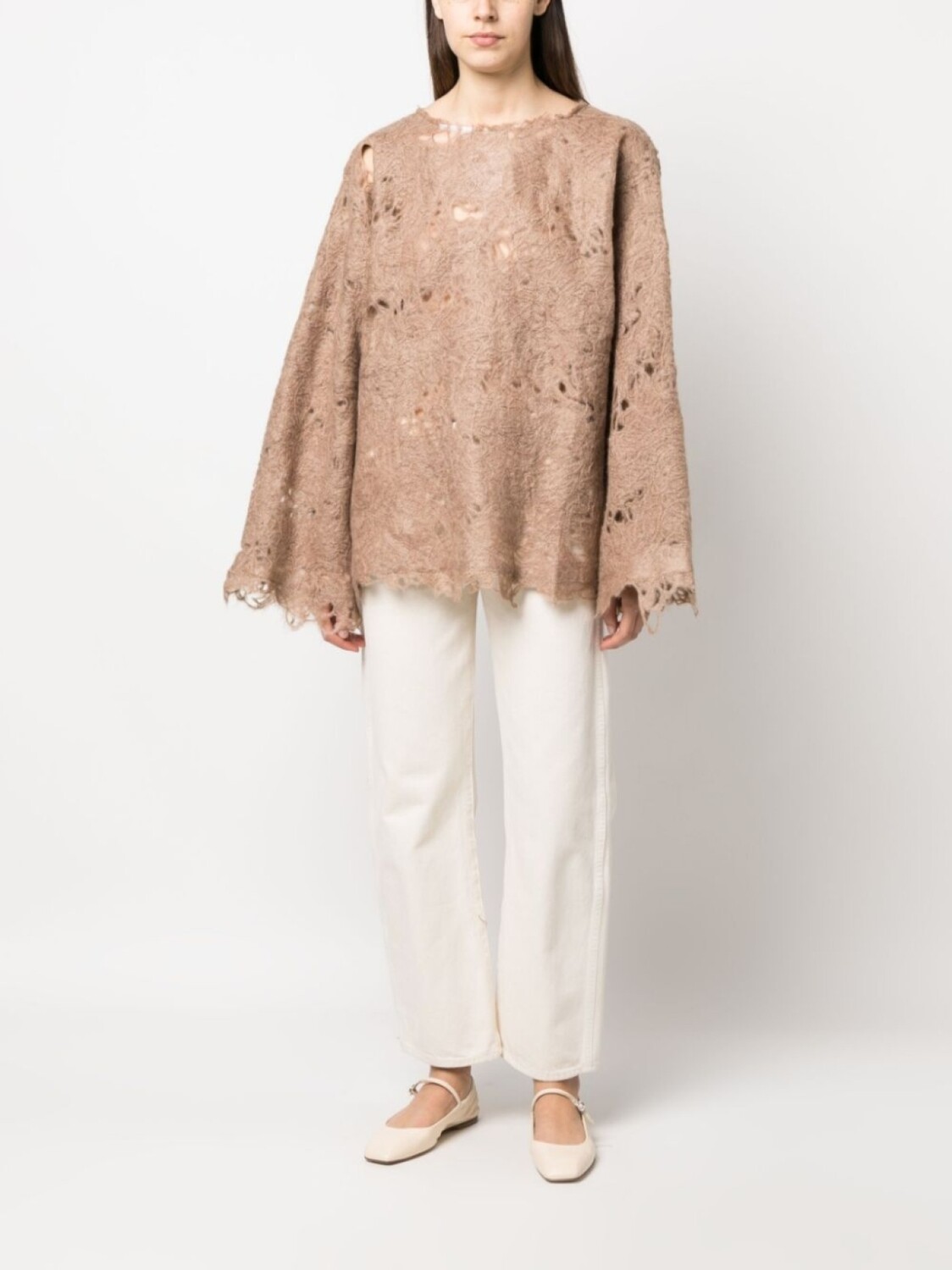 Экрю, смесовая шерсть, трикотажный материал, искусственно состаренное покрытие, круглый вырез, приспущенные плечи, длинные широкие рукава и необработанные края.