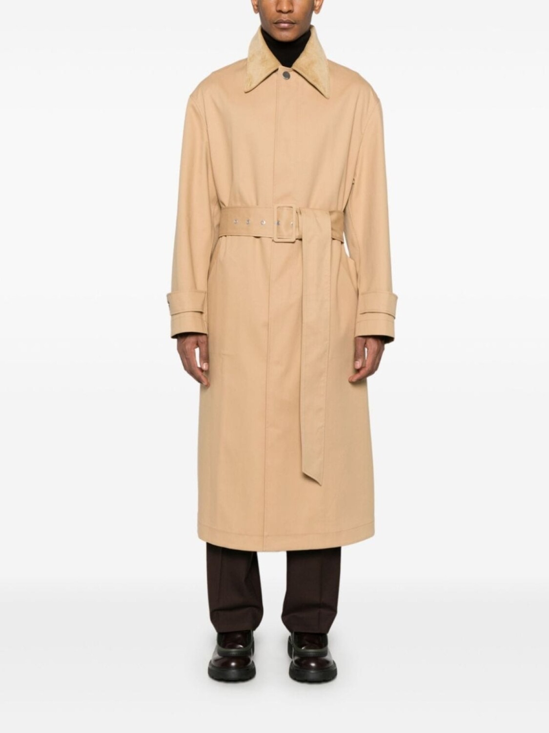 Подробнее о товаре: • бежевый • хлопок • съемный регулируемый ремень на талию • застежка на молнии спереди • потайная застежка на кнопках спереди • вельветовый воротник • приспущенные плечи • длинные рукава • манжеты с застежкой на кнопки • петли для ремня • два прорезных кармана сбоку • шлица по центру сзади • модель без подкладки • прямой подол • длинная модель • Это унисекс-модель. Обратите внимание, что для нее используется мужская размерная сетка.