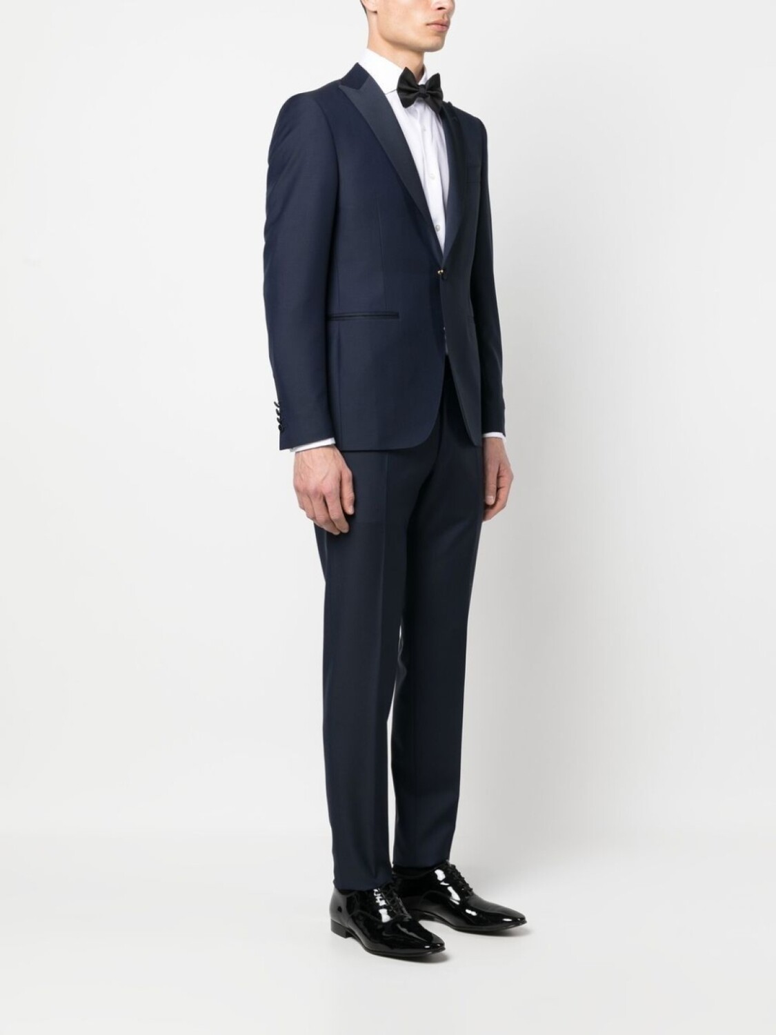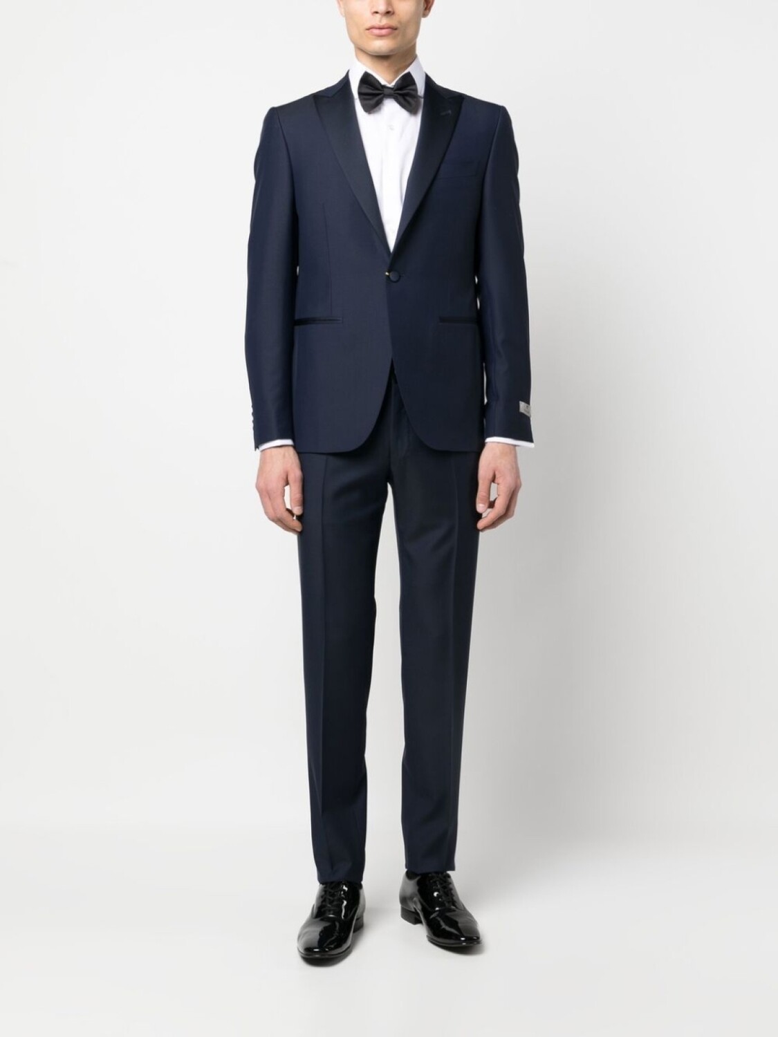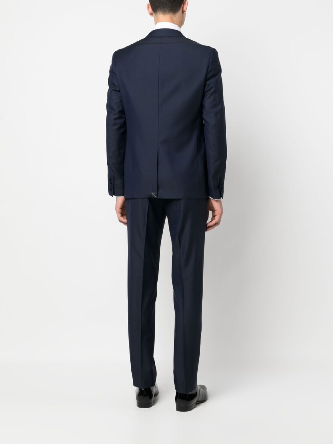 Синий, шерсть, нашивка с логотипом на рукаве, зазубренные лацканы, застежка на пуговицах спереди, нагрудный прорезной карман, два кармана с клапанами по бокам, длинные рукава, две боковые шлицы сзади, петли для ремня, застежка на пуговицах спереди, два кармана по бокам, два прорезных кармана на пуговицах сзади и узкий крой.
