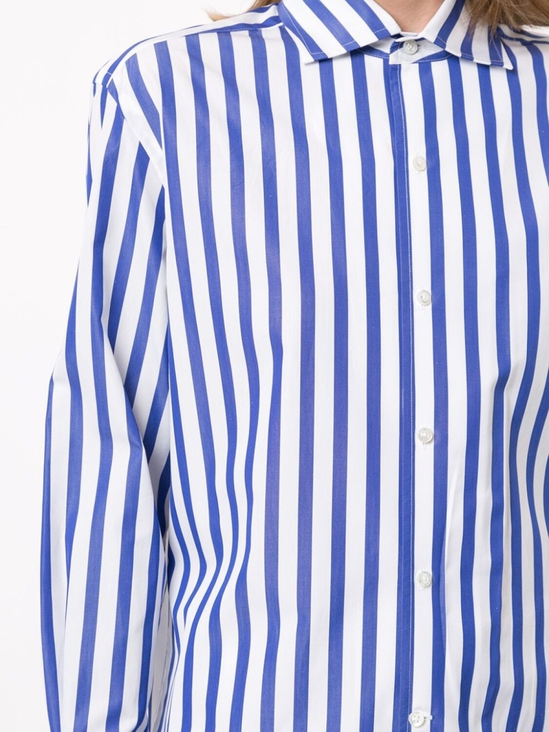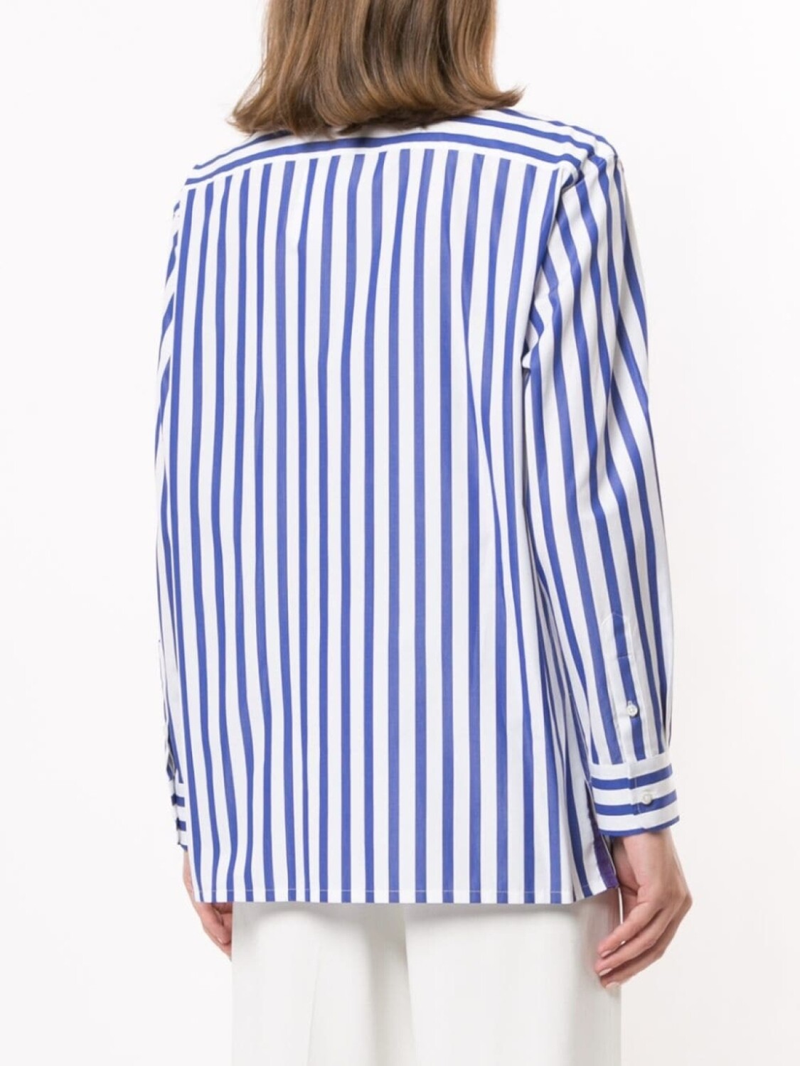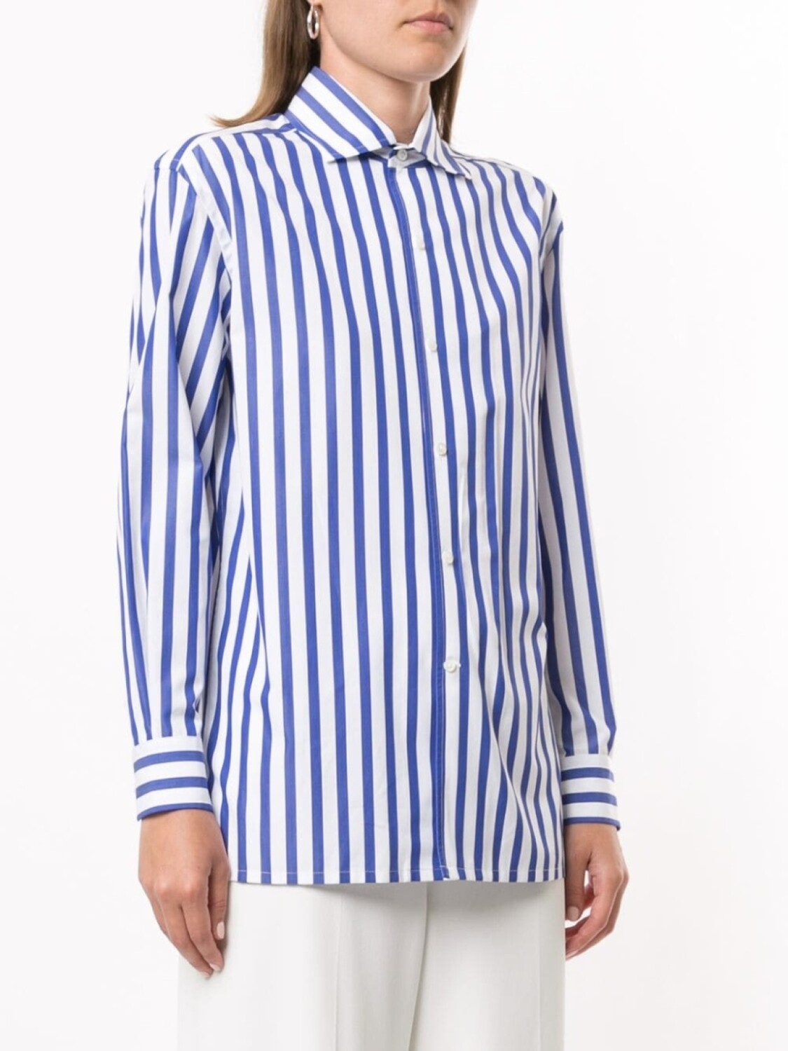 Классический воротник, застежка на пуговицах спереди, закругленный подол, длинные рукава и манжеты на пуговицах.