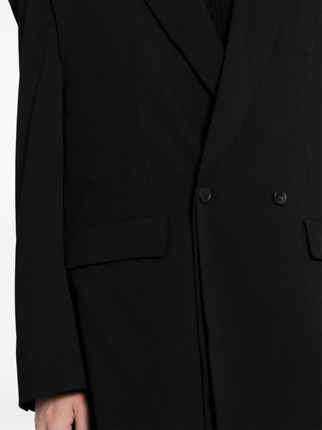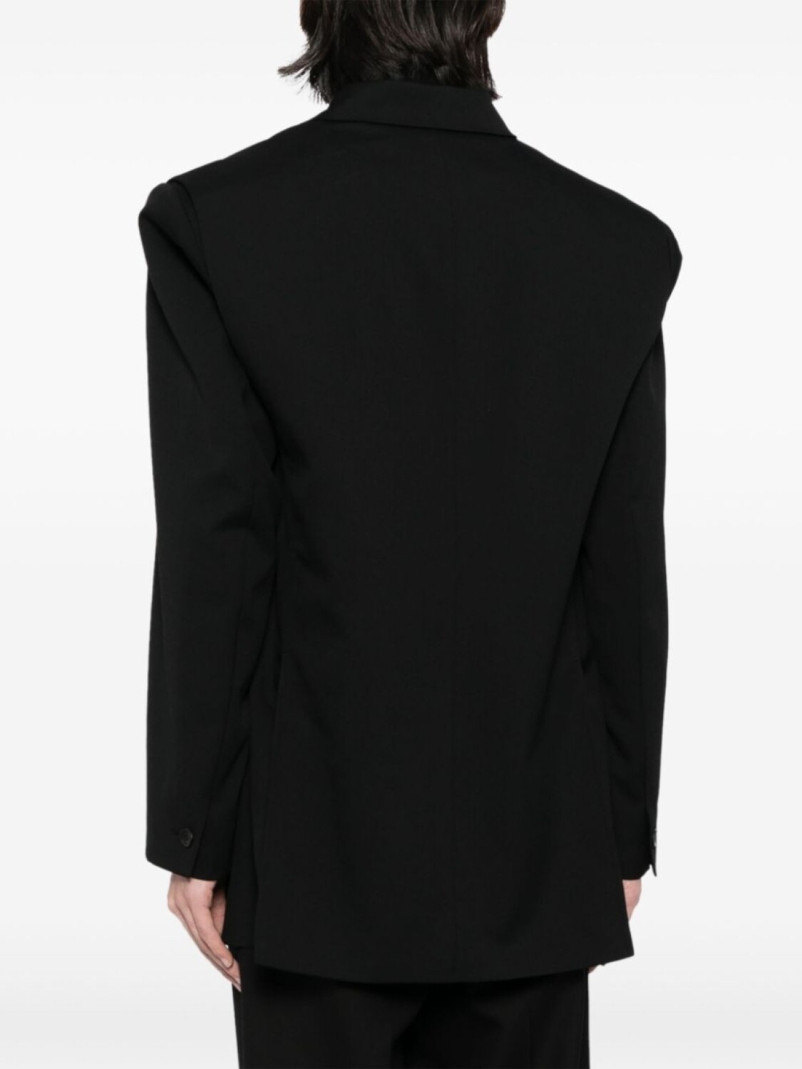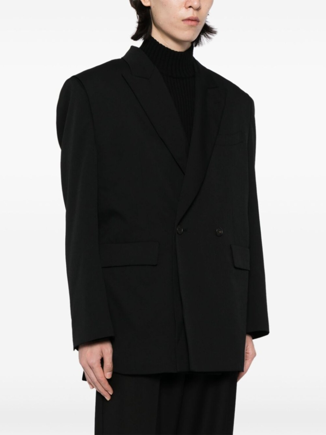 Многослойная деталь, строгий крой, заостренные лацканы, двубортная застежка на кнопки, манжеты на пуговицах, прорезной карман на груди, два передних кармана с клапанами и две боковые шлицы сзади.
