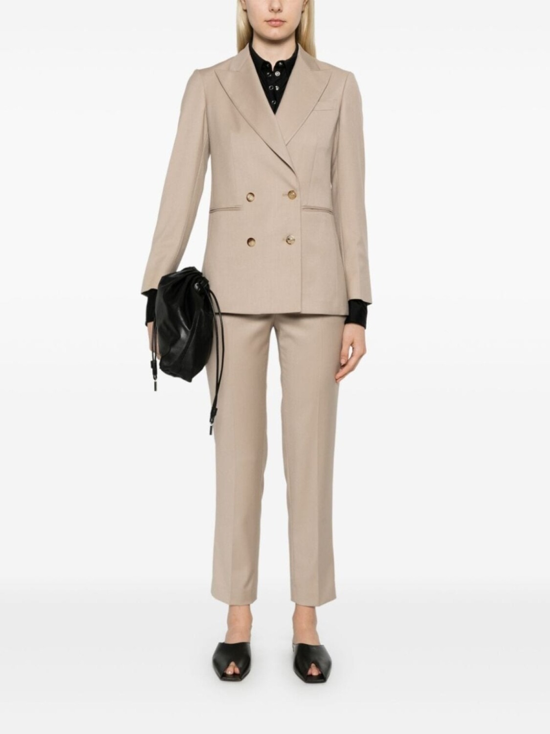 Коричневая текстурированная отделка, двубортный покрой, застежка на пуговицы, острые лацканы, подплечники, длинные рукава, манжеты на пуговицах, нагрудный прорезной карман, два боковых прорезных кармана, английские шлицы сзади, прямой подол