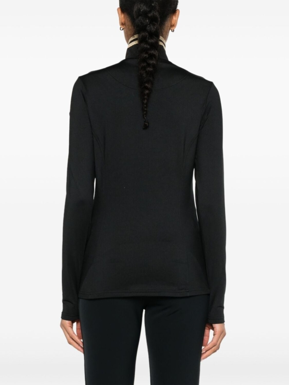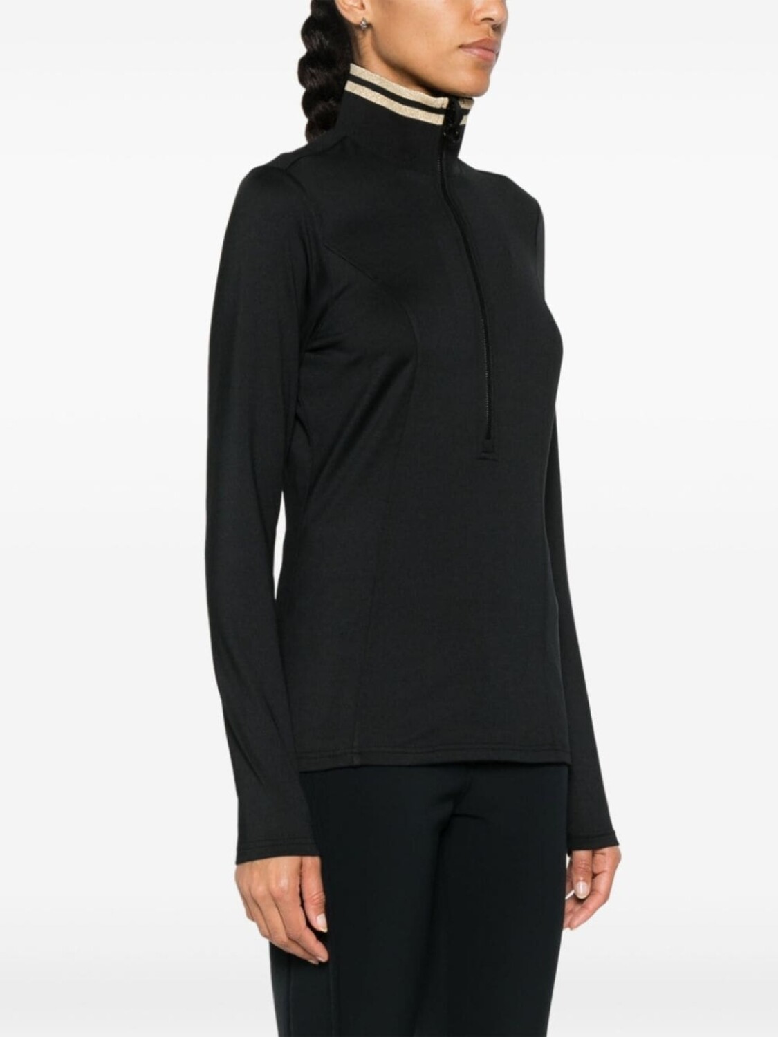 Черный, эластичная ткань, декоративные швы, логотип в тон, отделка в полоску с люрексом, высокий воротник, короткая застежка на молнии спереди, длинные рукава, прямой подол, флисовая подкладка