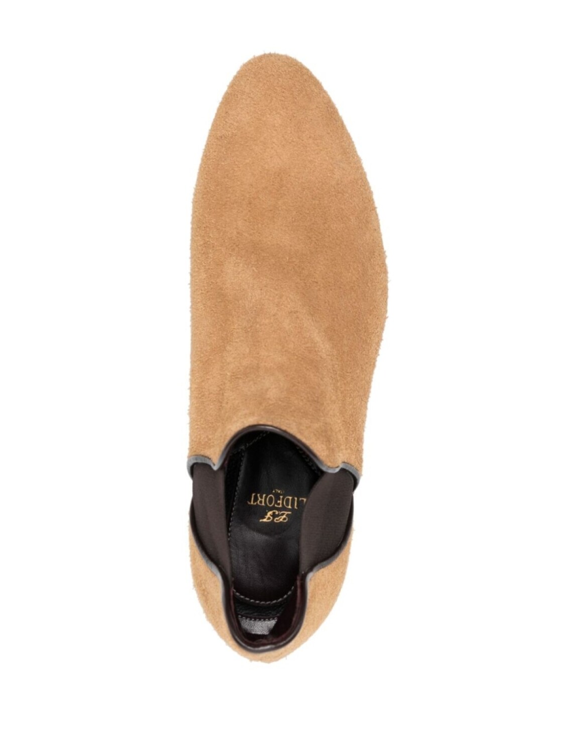 Бежево-коричневый, замша из телячьей кожи, модель без застежки, высота по щиколотку, эластичные боковые вставки, миндалевидный носок, кожаная стелька с логотипом и низкий блочный каблук.