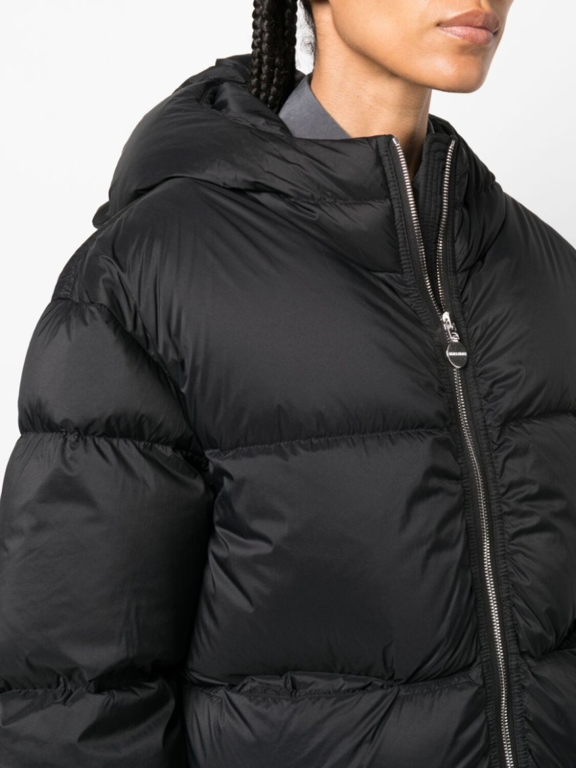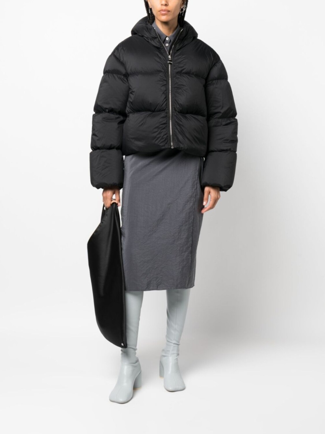 Черный, дутый материал, лакированное покрытие, декоративные ушки на капюшоне, классический воротник, застежка на молнии спереди, длинные рукава и прямой подол.