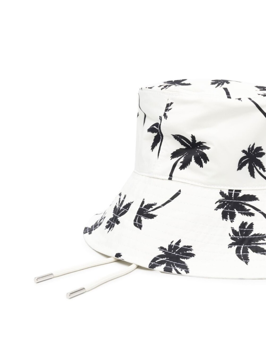 Белый, хлопок, принт с изображением пальм, модель ведро, строчка в тон, узкие опущенные поля и застежка на шнурке.