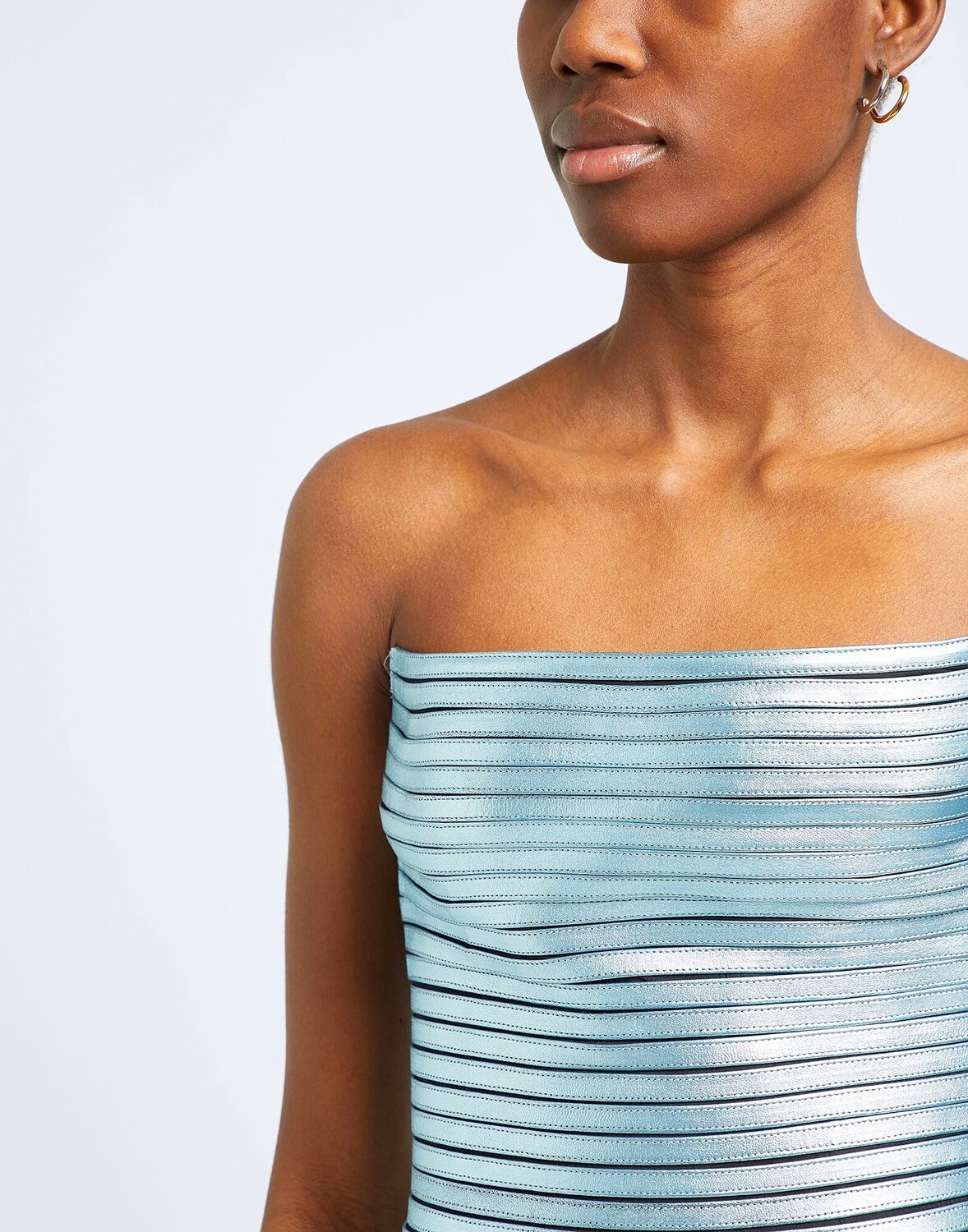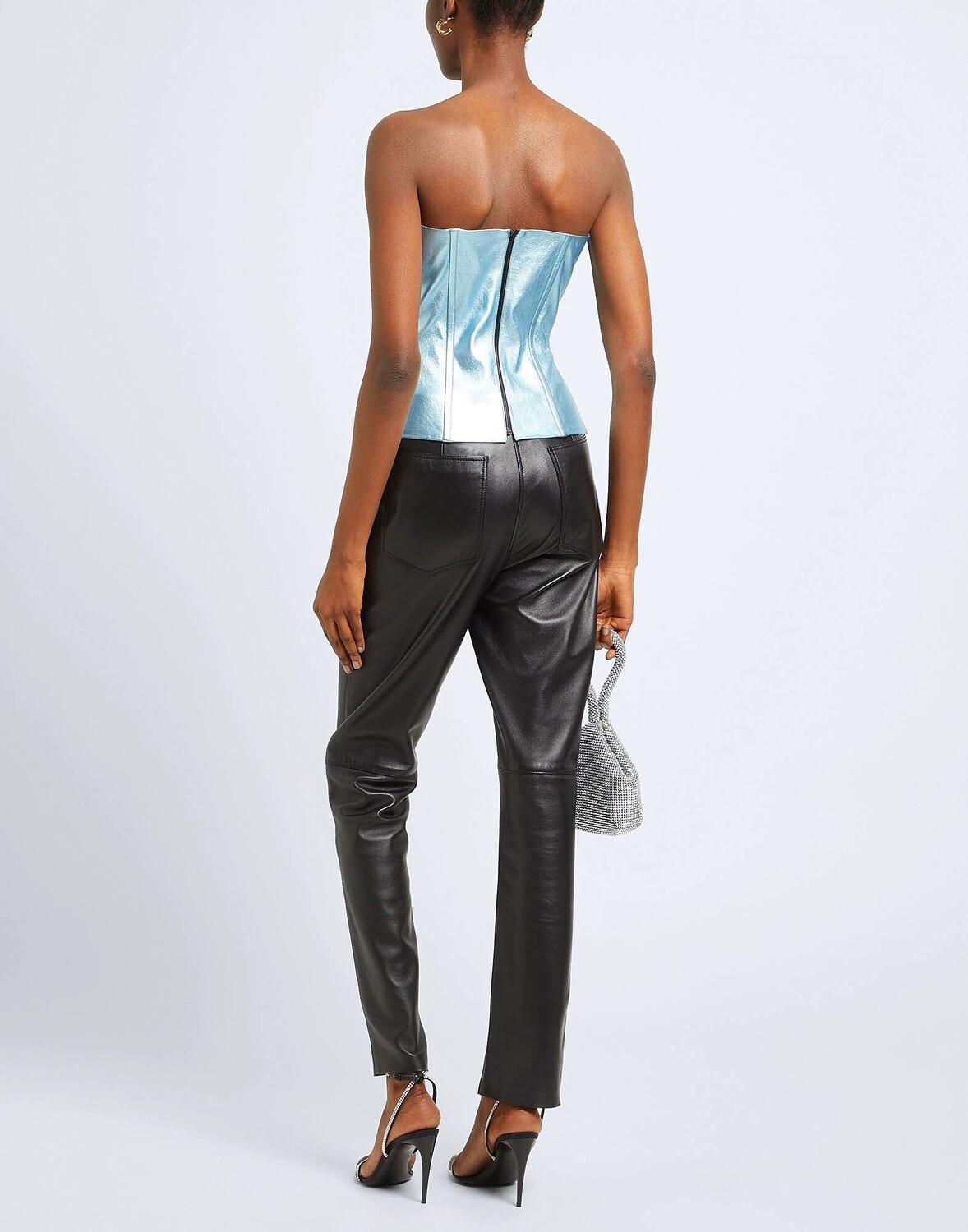 Кожа, металлик, без аппликаций, двухцветный, глубокий вырез, без рукавов, застежка-молния, без карманов, содержит нетекстильные части животного происхождения, нельзя стирать, нельзя сушить в стиральной машине, не отбеливать, нельзя гладить, топ