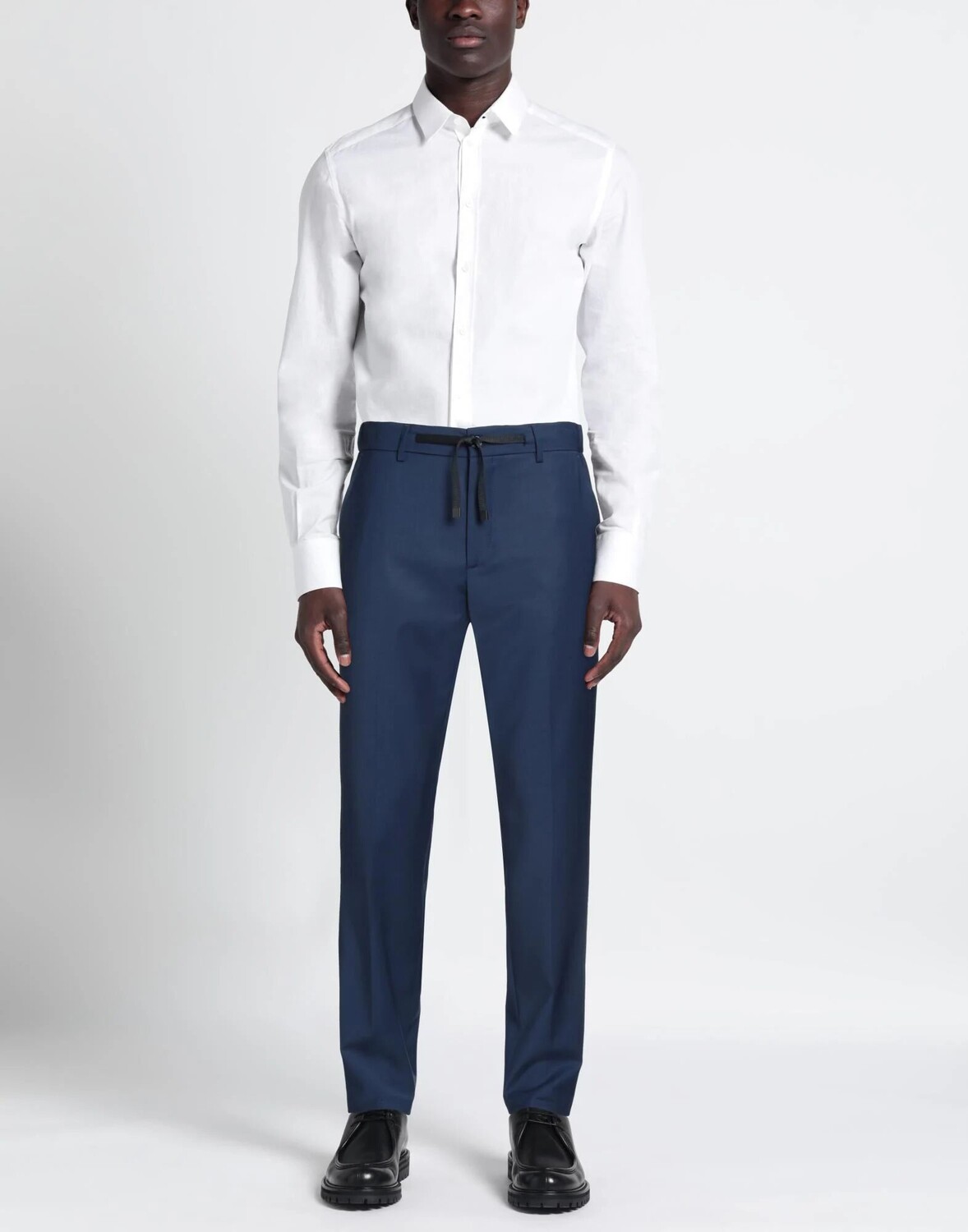Полотняное переплетение, без аппликаций, одноцветное изделие, завышенная талия, шлевки для ремня, прямые брючины, стандартный крой, застежка-молния, 1 пуговица, несколько карманов, индивидуальный пошив
